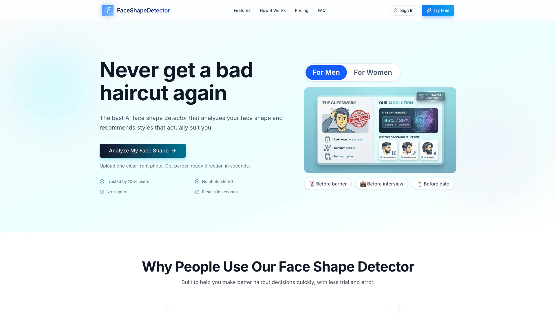 這個 AI 臉型檢測器使用先進的算法來提供更準確的臉型分析,而不是像其他工具那樣強迫使用單一標籤。它結合了面部識別技術和黃金比例原則,提供個性化的髮型建議。