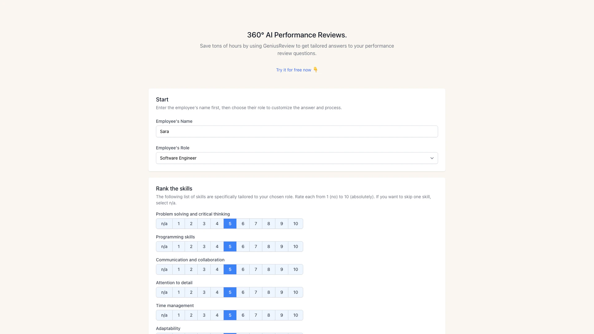 - 量身訂做的績效評估: GeniusReview根據員工的角色提供定制的績效評估問題答案,節省時間並增強相關性。