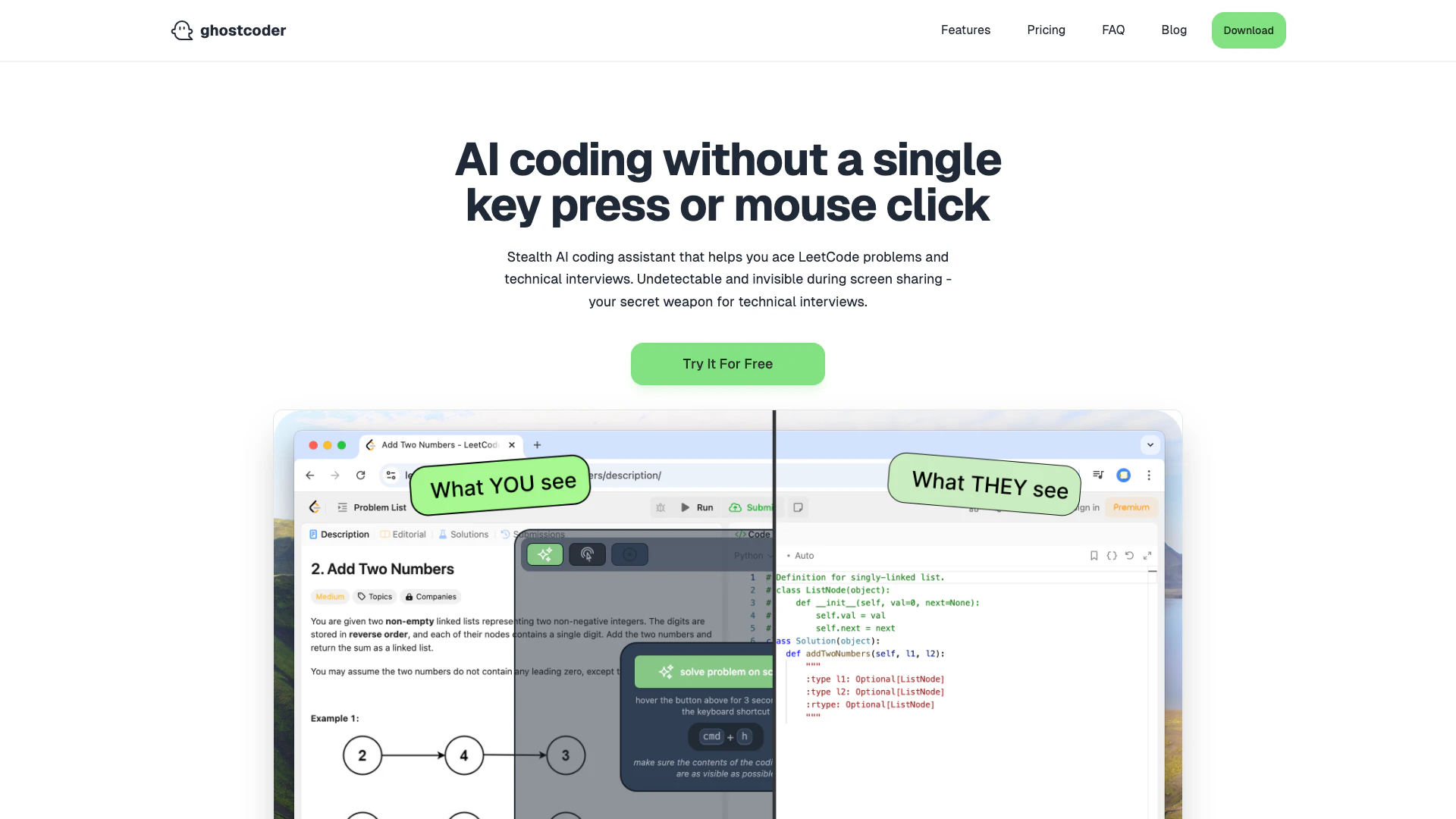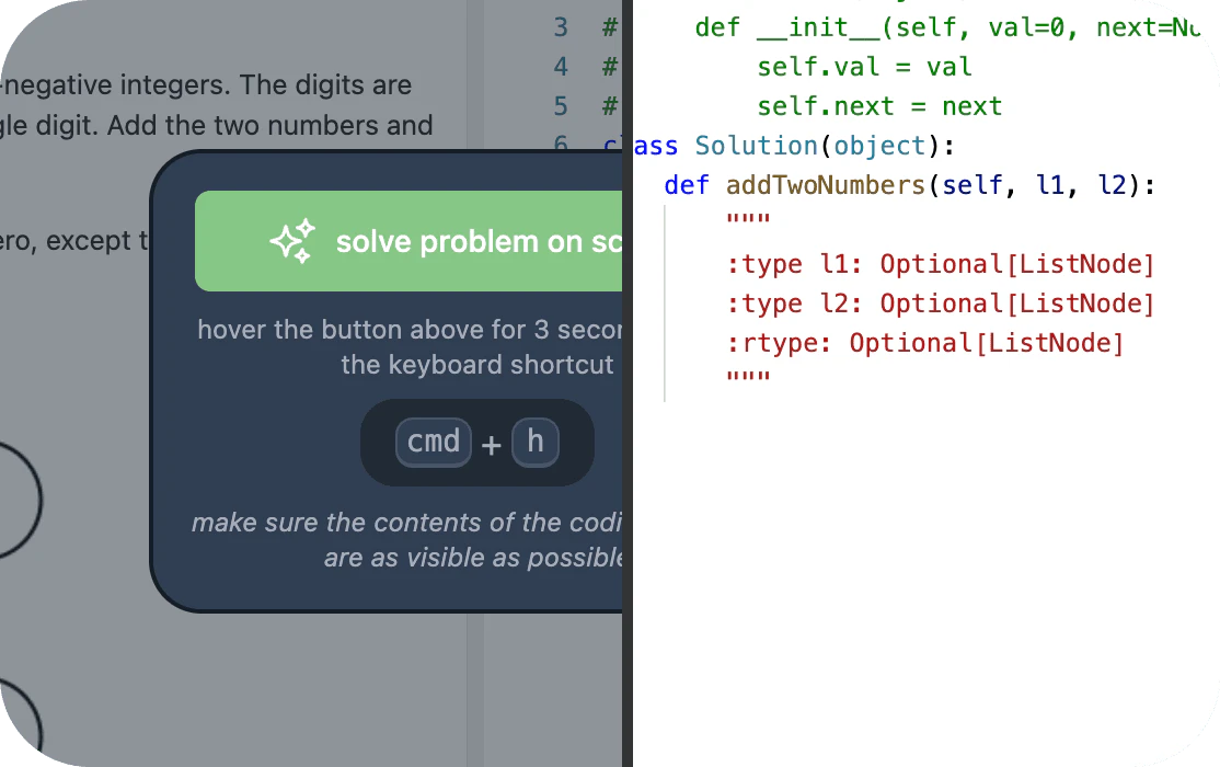 - 參加編碼面試:在您的編碼面試或解決 LeetCode 問題時,啟動 Ghostcoder。它將提供編碼建議和解決方案,而無需任何實體互動,確保流暢且不可檢測的體驗。