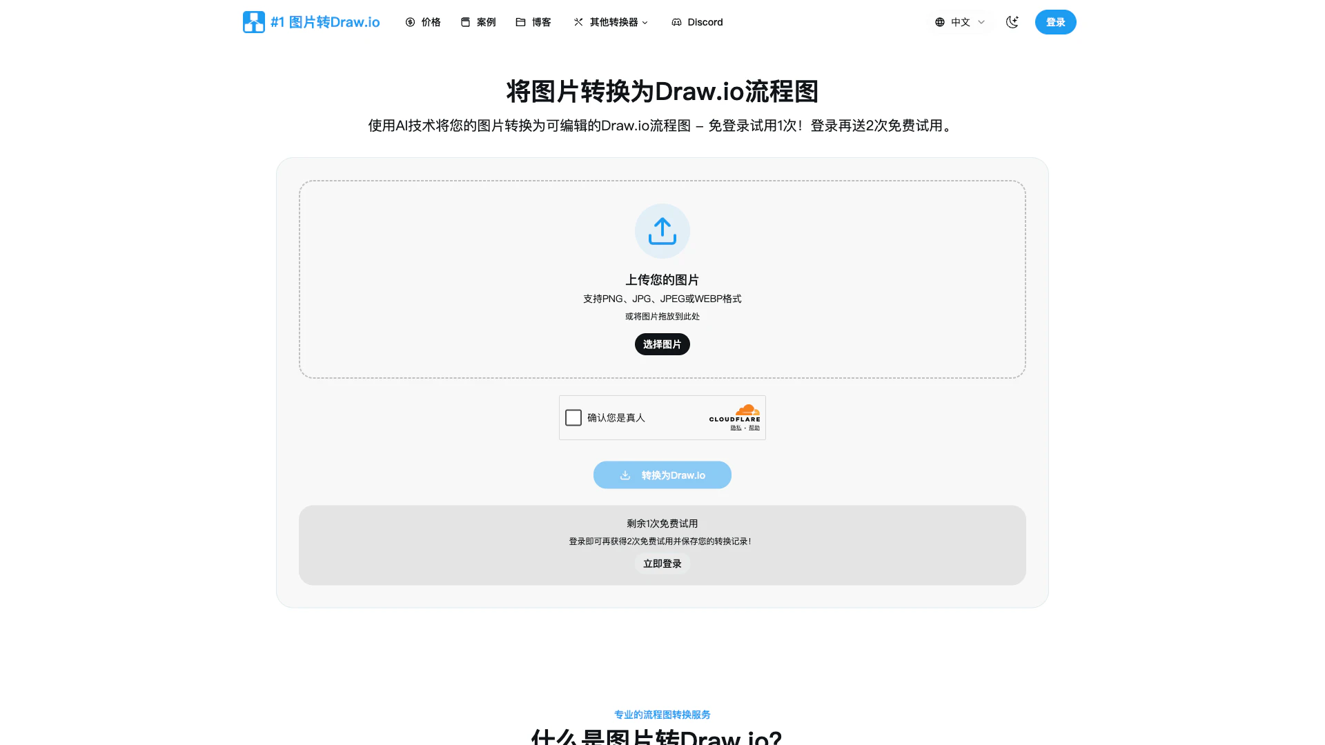 - AI 驅動的轉換:利用先進的 AI 準確地將圖像轉換為可編輯的 Draw.io 圖表,識別形狀、文本和連接。