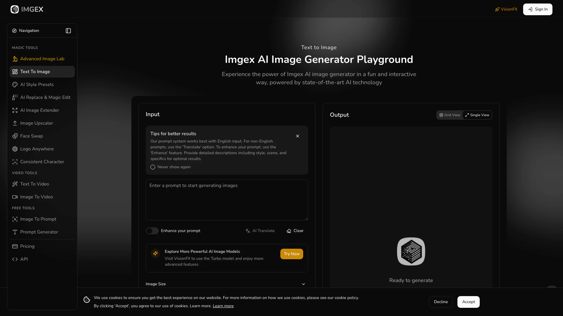 要開始使用 Imgexai,請按照以下步驟操作: 1. 訪問 Imgexai 遊樂場 https://imgex.ai/playground。 2. 在輸入框中輸入描述性提示,具體說明樣式、場景以及您想要的任何細節。 3. 選擇所需的圖像大小和您希望生成的圖像數量。 4. 從 Turbo、Boost、Pro 或 Ultra 等選項中選擇生成模式,以獲得不同的輸出質量。 5. 點擊「生成」按鈕,根據提供的提示創建您的圖像。
