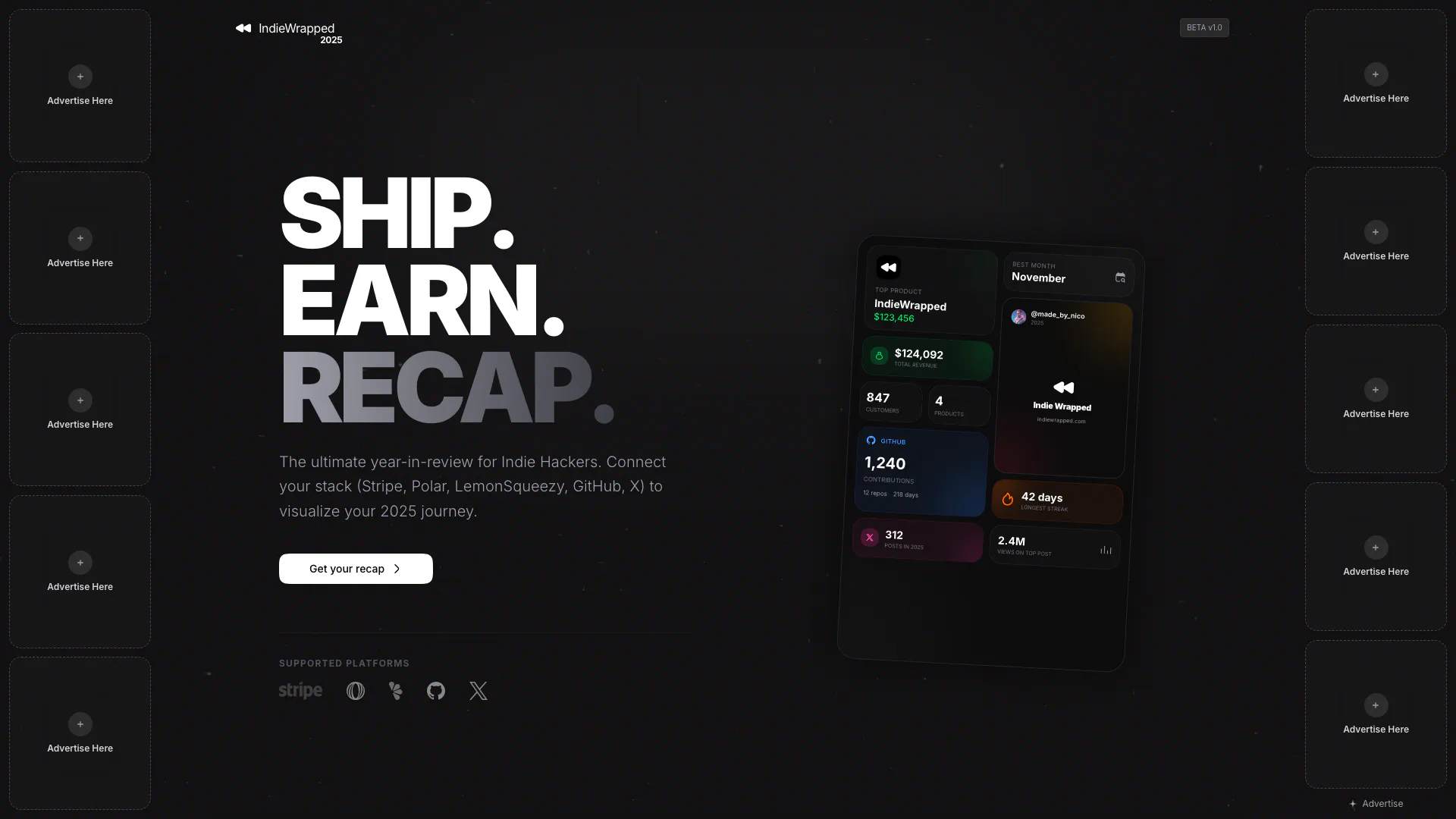 為獨立開發者提供的終極年度回顧。連接您的工具(Stripe、Polar、LemonSqueezy、GitHub、X),以可視化您的2025年旅程。