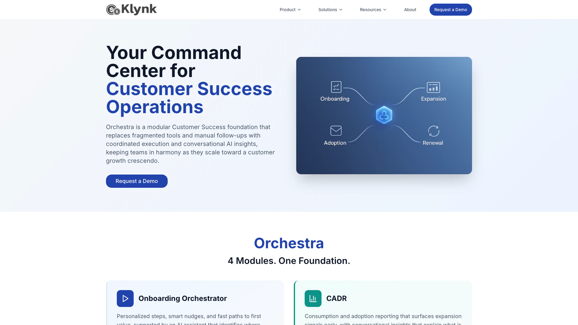Orchestra是Klynk的模組化客戶成功運營平台。它通過四個核心模組為您的客戶成功運營帶來結構、自動化和智能:入職協調器、QBR生成器、續約風險升級器和CADR。