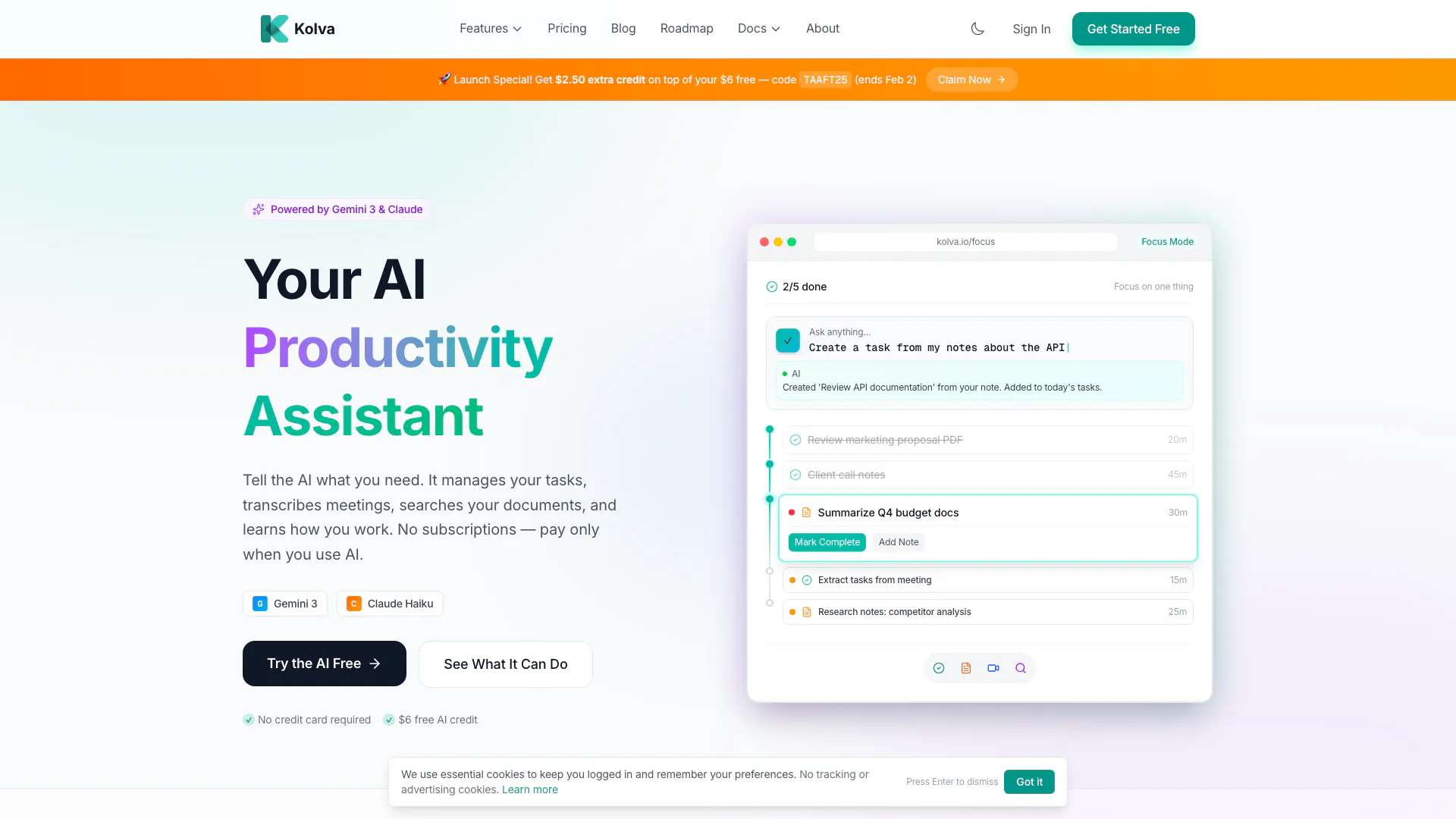 Kolva 是一個由 AI 驅動的生產力助手,旨在簡化任務管理、轉錄會議和促進文件搜索。利用先進的 AI 模型,如 Gemini 3 和 Claude,Kolva 了解您的工作方式,幫助您高效管理任務,而無需訂閱的負擔。用戶只需支付他們使用的 AI 服務費用,使其成為提高生產力的成本效益解決方案。