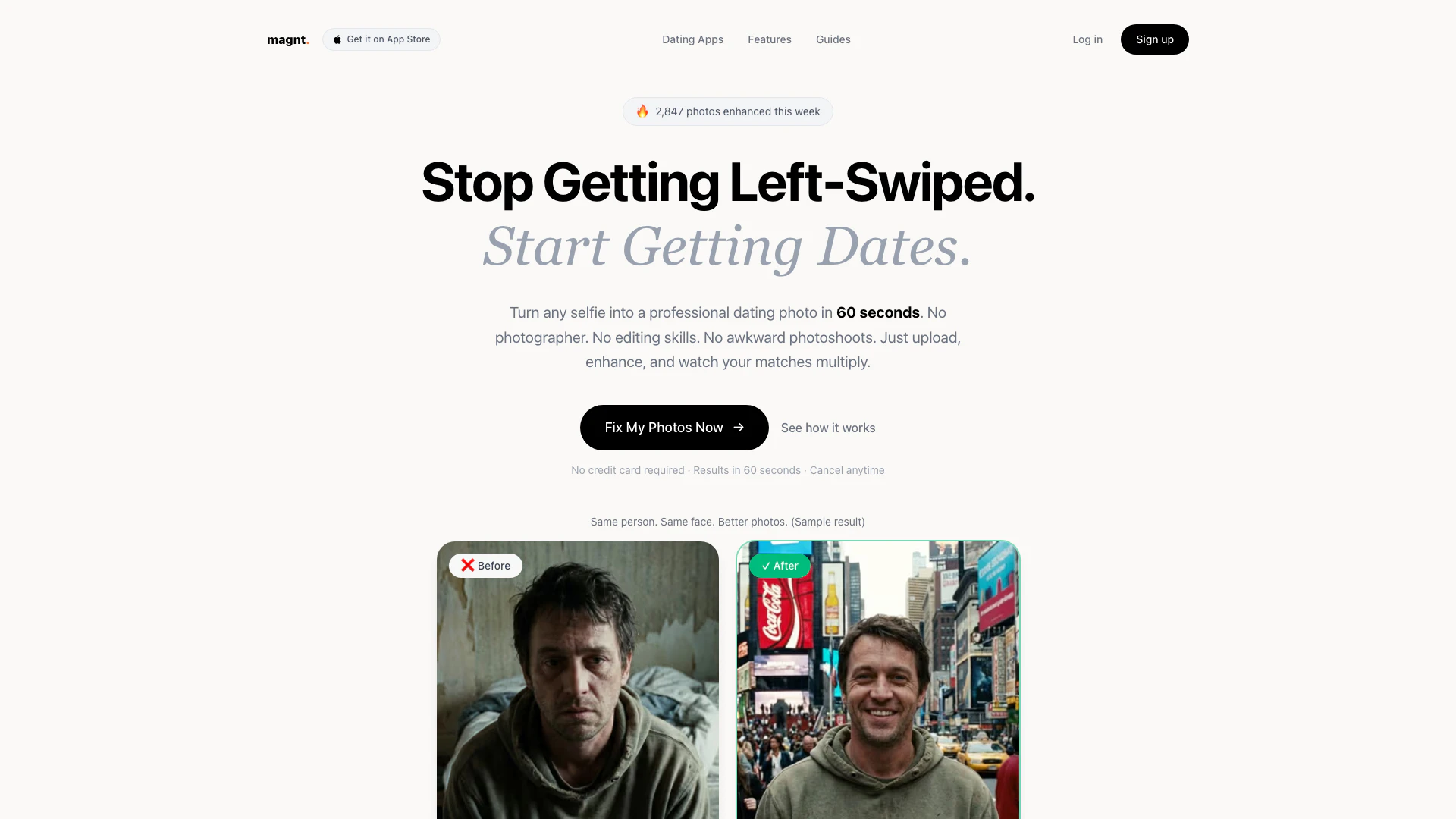 Magnt 是一個創新的 AI 驅動工具,旨在將任何自拍轉換為專業質量的約會照片,只需 60 秒。它專為那些希望提升在線約會資料的個人而設計,無需昂貴的攝影師或高級編輯技能。使用 Magnt,使用者可以輕鬆上傳自拍,AI 將優化光線、顏色和構圖,產生引人注目的圖像,顯著提高在流行約會平台上的匹配率。通過加入超過 2,500 名滿意的用戶,個人可以期待看到其匹配數量增加三倍,使 Magnt 成為任何認真改善約會生活的人的必備工具。