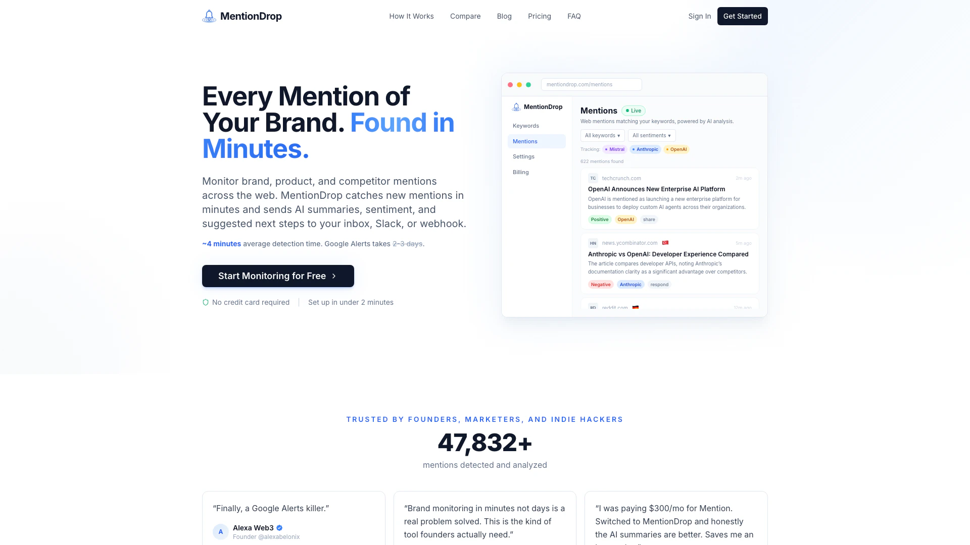 Google Alerts 依賴 Google 的索引,這會漏掉許多頁面,並且可能需要幾天才能通知您。MentionDrop 實時監控網絡,然後添加 AI 摘要和情感分析,讓您能夠更快行動。