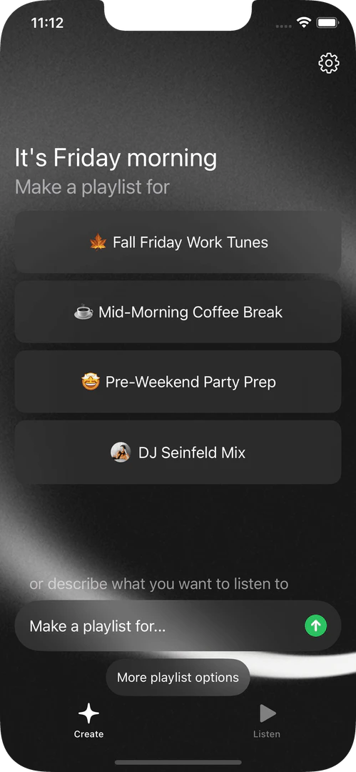 - 通過輸入提示(例如「Lo-fi 學習音樂」或「2000 年代早期的流行音樂」)來描述您想要的播放列表類型。
