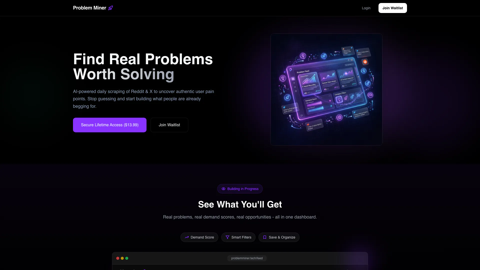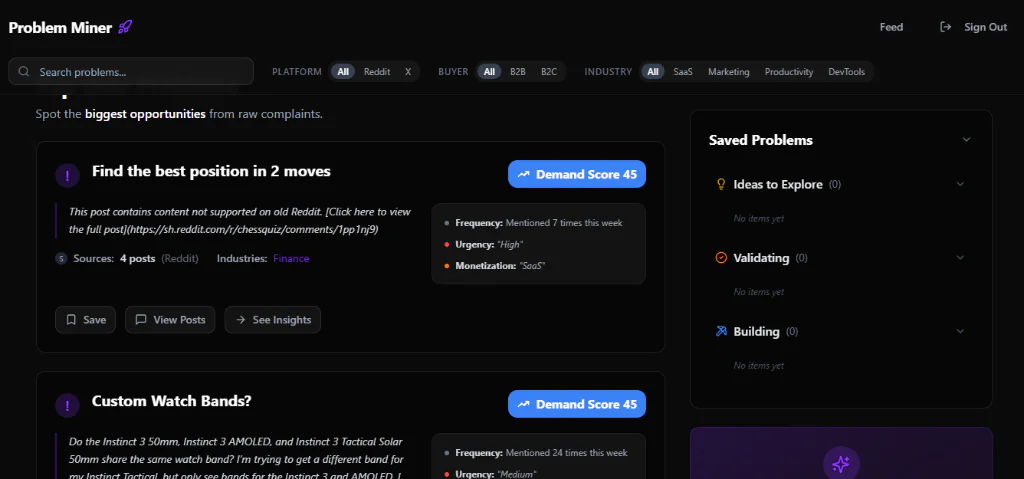 - 人工智慧驅動的洞察: 利用人工智慧每日抓取Reddit和X,揭示真實用戶的痛點和經過驗證的創業想法。