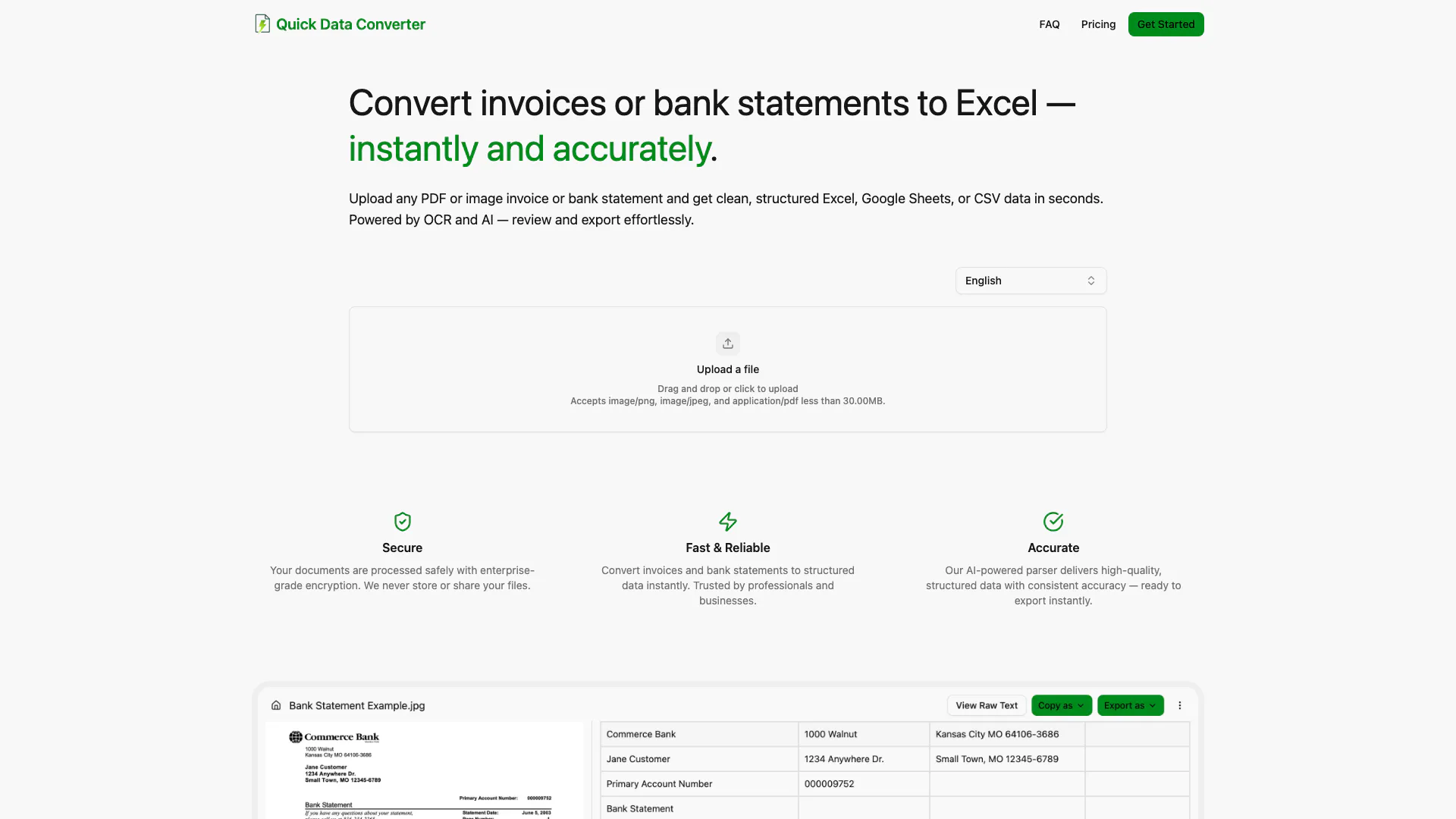 快速數據轉換器是一種工具,允許用戶快速而準確地將PDF或圖像發票和銀行對賬單轉換為結構化數據格式,如Excel、Google Sheets和CSV。