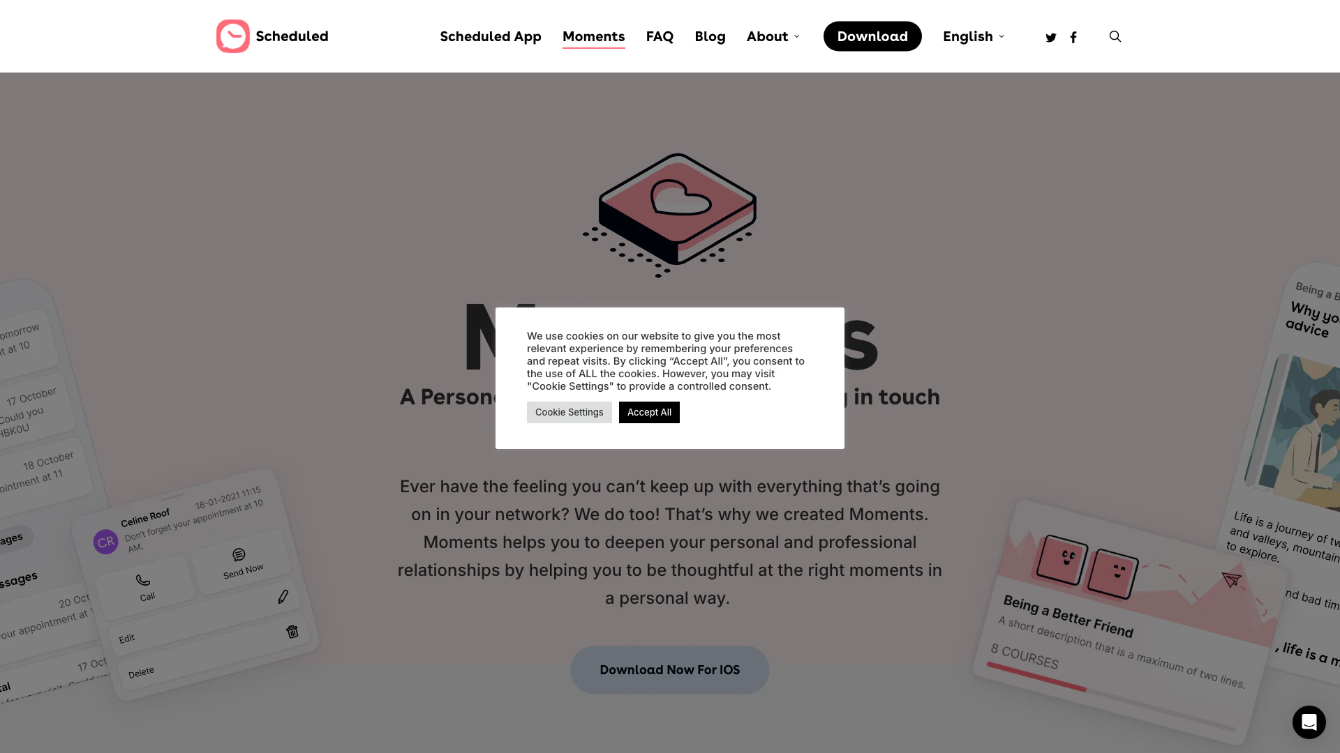 Scheduledapp Moments 是一款個人關係管理工具,旨在幫助用戶加深他們的個人和專業關係。通過在合適的時刻促進深思熟慮的互動,它幫助用戶與他們的網絡保持聯繫。該應用程序提供的功能有助於組織社交聯繫、管理提醒和增強溝通,最終減少壓力和認知負擔。