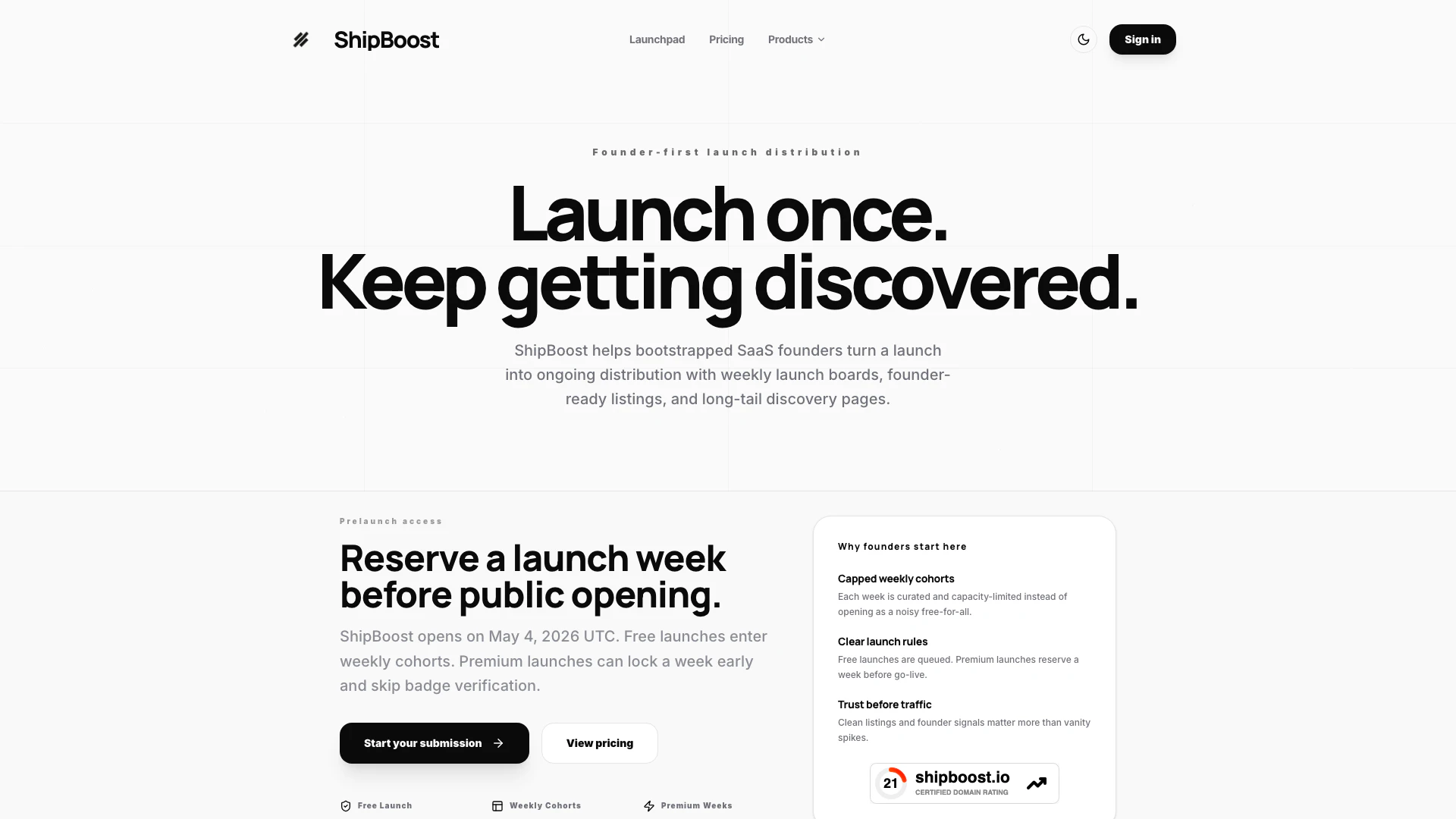 Shipboost 是一個專為自助創業的 SaaS 創始人設計的創新平台,使他們能夠將產品發布轉變為可持續的長期分發。通過提供精心策劃的每週發布板、乾淨的公共列表和有效的發現路徑,Shipboost 確保產品的可見性超越了初始發布日。該平台強調質量而非數量,幫助創始人通過結構化的發布過程與潛在用戶建立信任和可信度。