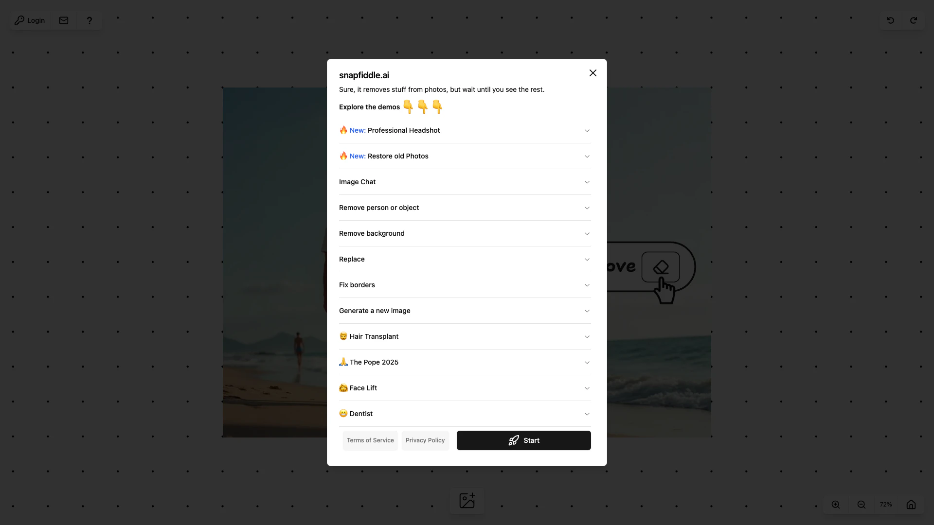 Snapfiddleai 是一款用戶友好的圖像編輯工具,旨在簡化修改圖像的過程。使用 Snapfiddleai,用戶可以輕鬆地刪除和替換圖像中的人物和物體,通過智能裁剪合併多張圖像,並修復損壞或不完整的照片。其直觀的界面使其對初學者和經驗豐富的用戶都很友好,提供強大的編輯功能,而不會像傳統圖像編輯軟件那樣複雜。