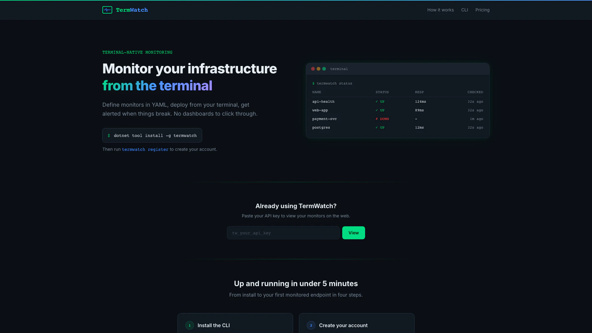 - 創建帳戶:通過執行 `$ termwatch register` 註冊您的電子郵件以獲取 API 密鑰。