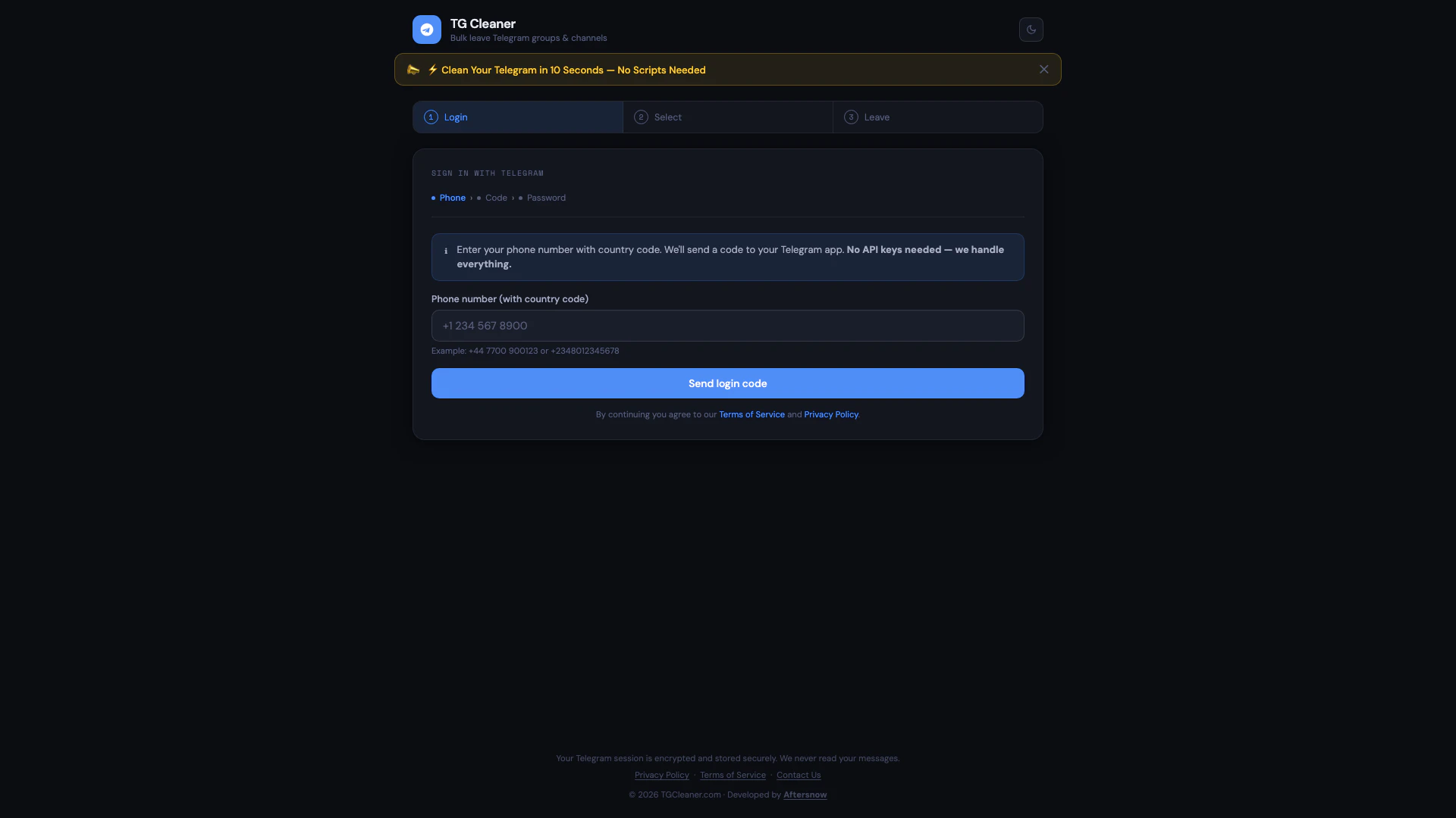 - 通過輸入帶國家代碼的手機號碼登錄 Tgcleaner。您將通過 Telegram 收到驗證碼。