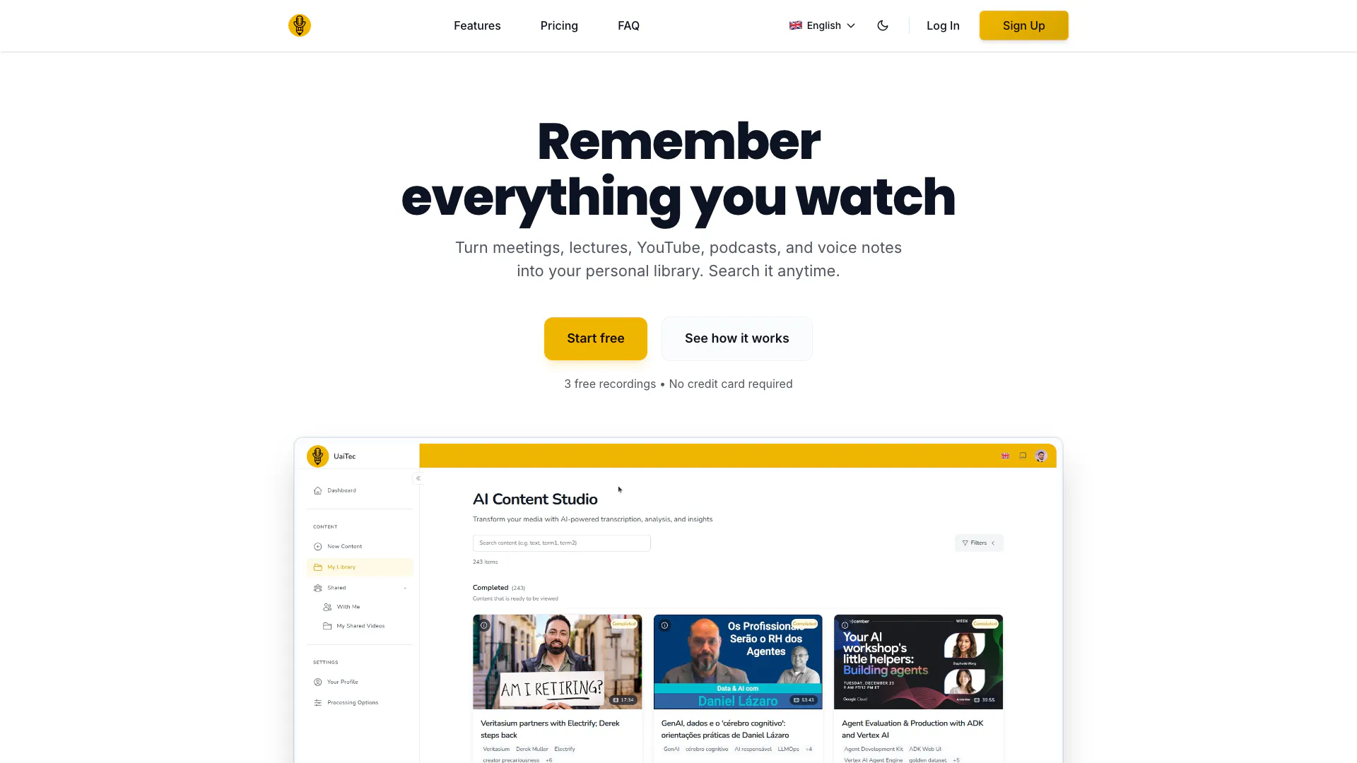 UaiTec 是一個 AI 驅動的平台,可以將任何音頻或視頻轉換為可搜索的知識。常見的使用案例包括會議(無需機器人)、在線課程、YouTube 研究、播客、醫生就診、面試、語音備忘錄和上傳的錄音。與僅專注於會議的替代方案不同,UaiTec 可以處理您捕獲的任何內容。