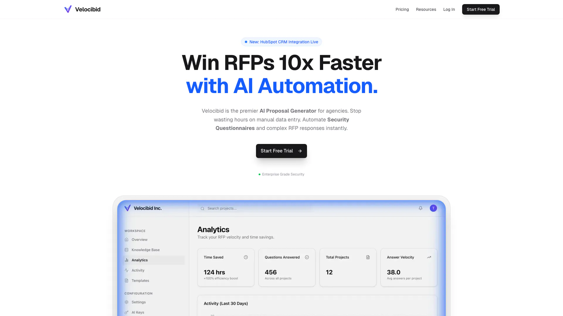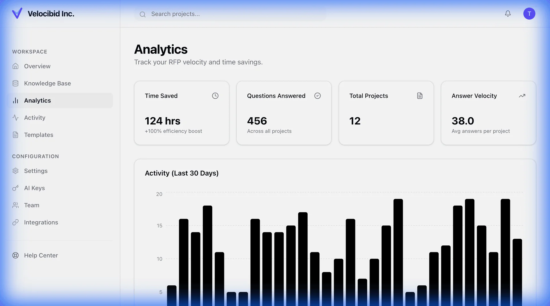 - AI 分析:Velocibid 將分析上傳的文檔,識別問題並使用您現有的知識庫生成草擬答案。