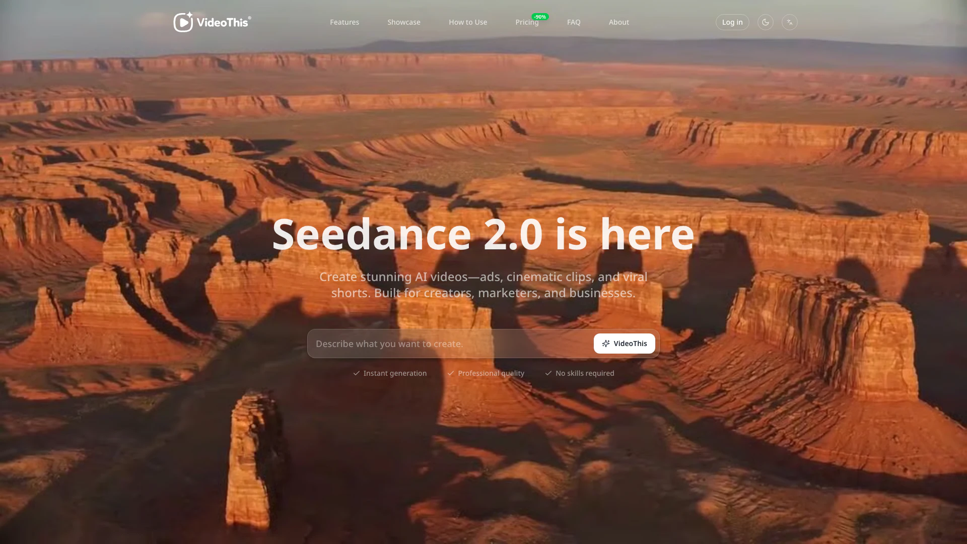 VideoThis®是一個平台,使用戶能夠創建驚人的AI生成視頻,包括廣告、電影片段和病毒短片,使用像Seedance 2.0這樣的先進AI模型。