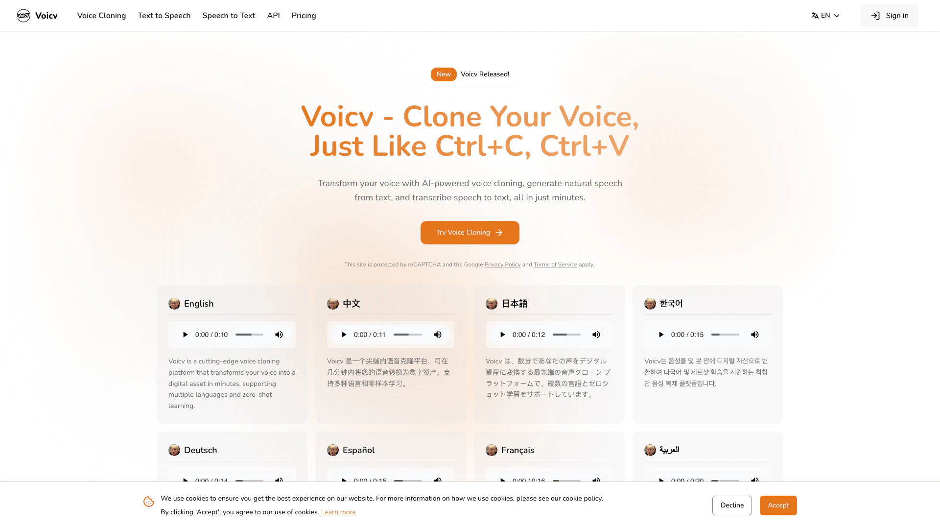 Voicv提供先進的AI語音克隆、文本轉語音和語音轉文本服務,讓用戶能夠利用尖端技術創建和轉換音頻。