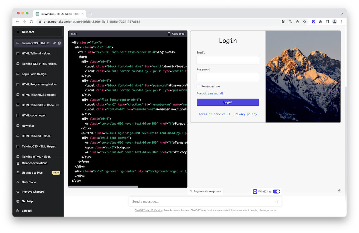 Windchat 是一個 Chrome 擴展,將 ChatGPT 轉變為前端開發助手,允許用戶即時構建和預覽 TailwindCSS HTML 元件。