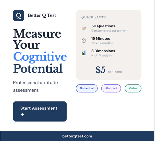 Một bài đánh giá được thiết kế khoa học đánh giá khả năng nhận thức của bạn qua các chiều số, trừu tượng và lý luận ngôn ngữ. Đánh giá chuyên nghiệp 50 câu hỏi với báo cáo điểm toàn diện, phân tích ba chiều, phân tích tốc độ so với độ chính xác và gửi báo cáo qua email.