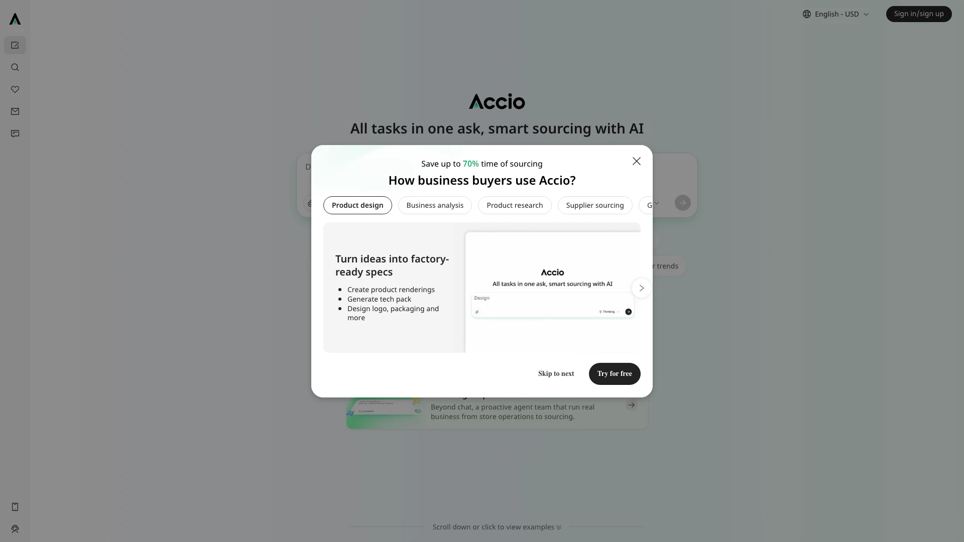 Accio là một công cụ tự động hóa kinh doanh sáng tạo được thiết kế để tối ưu hóa các nhiệm vụ vận hành khác nhau cho các doanh nhân và doanh nghiệp. Nó tận dụng công nghệ AI tiên tiến để tự động hóa các quy trình như thiết kế, phân tích xu hướng, tìm nguồn cung ứng, hoạt động cửa hàng, SEO và tiếp thị. Bằng cách tích hợp các chức năng này vào một nền tảng duy nhất, Accio giúp người dùng biến ý tưởng của họ thành những dự án có lợi nhuận một cách dễ dàng, trở thành một đồng minh mạnh mẽ cho bất kỳ ai muốn tối ưu hóa hoạt động kinh doanh của mình.
