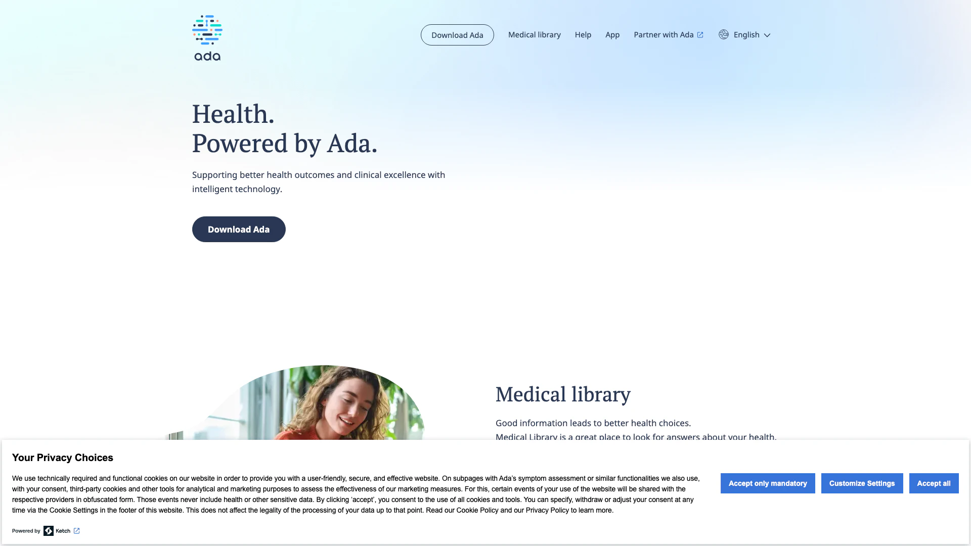 Ada là một công cụ quản lý sức khỏe cung cấp đánh giá triệu chứng để giúp cá nhân hiểu và quản lý sức khỏe của họ. Bằng cách tận dụng công nghệ thông minh, Ada cung cấp những hiểu biết và giải pháp sức khỏe cá nhân hóa, nâng cao cả quản lý sức khỏe cá nhân và dịch vụ chăm sóc sức khỏe doanh nghiệp. Nền tảng được thiết kế để trao quyền cho người dùng với kiến thức về tình trạng sức khỏe và triệu chứng của họ, cuối cùng hỗ trợ kết quả sức khỏe tốt hơn.
