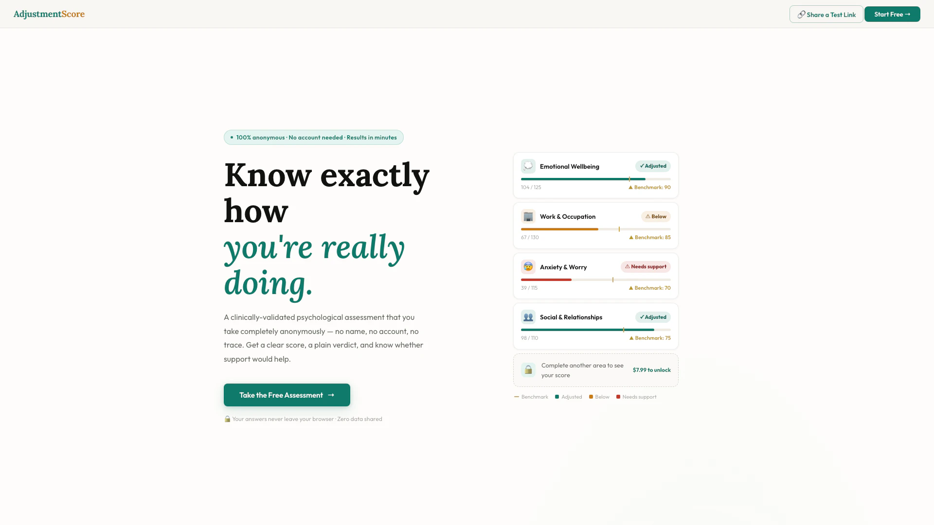 AdjustmentScore là một công cụ tự đánh giá tâm lý đã được xác thực lâm sàng, được thiết kế để cung cấp cho người dùng cái nhìn sâu sắc về sức khỏe tâm thần và cảm xúc của họ. Nền tảng sáng tạo này cho phép cá nhân thực hiện một bài đánh giá miễn phí một cách ẩn danh mà không cần tài khoản. Trong vòng vài phút, người dùng nhận được một điểm số phản ánh trạng thái tâm thần hiện tại của họ trên nhiều lĩnh vực cuộc sống, chẳng hạn như sức khỏe cảm xúc, công việc và các mối quan hệ. Công cụ này được xây dựng dựa trên Pin đánh giá điều chỉnh đa chiều (MAB), một bài đánh giá tâm lý đáng tin cậy được sử dụng bởi các chuyên gia, đảm bảo rằng người dùng nhận được những cái nhìn chính xác và có thể hành động về sức khỏe tâm thần của họ.