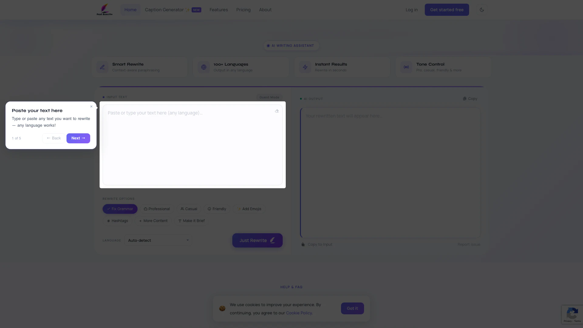 Just Rewrite là một công cụ viết AI tiên tiến giúp bạn cải thiện kỹ năng viết của mình bằng cách cung cấp kiểm tra ngữ pháp, gợi ý phong cách và diễn đạt lại nội dung.