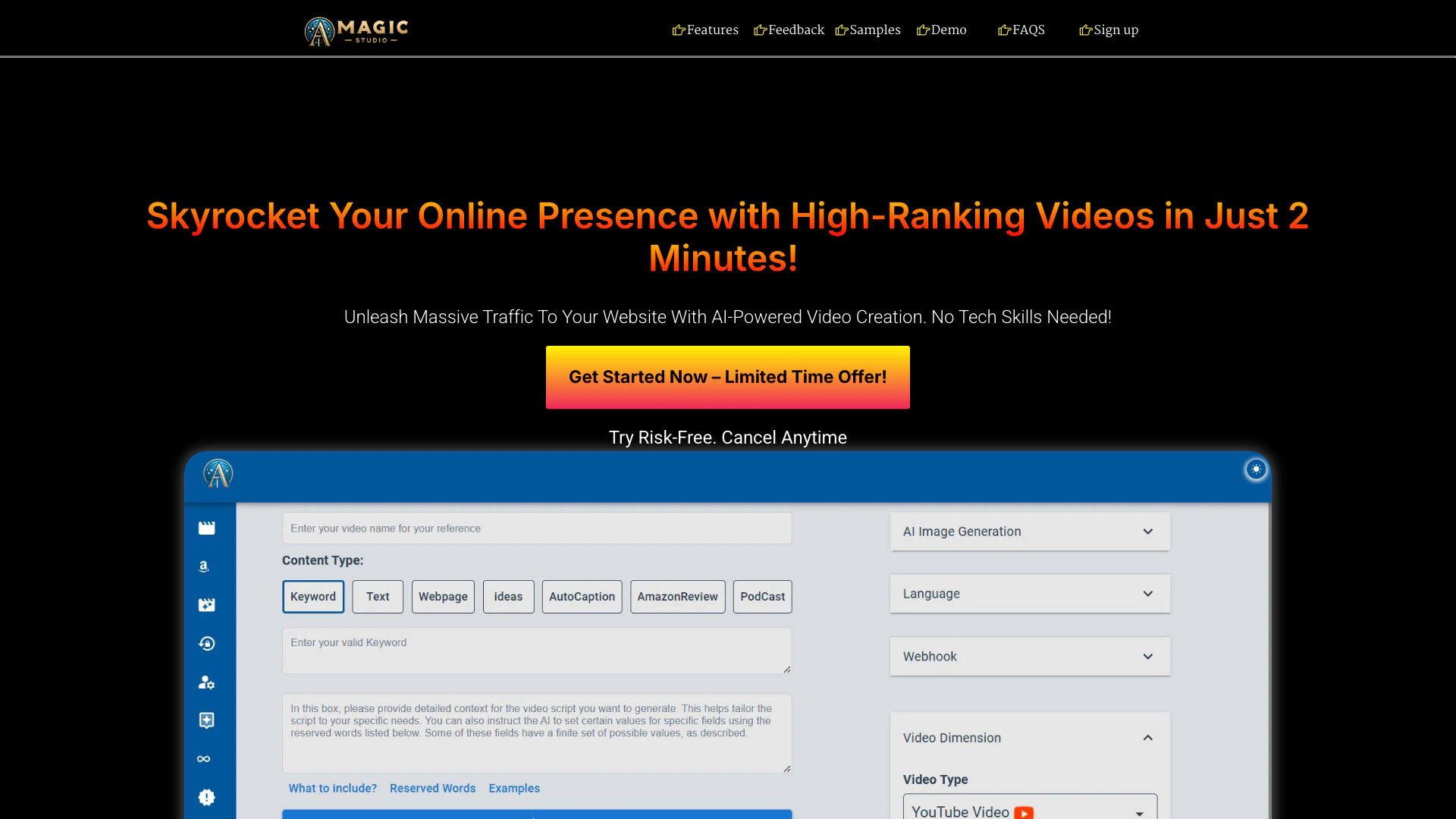 AIMagicStudio là một nền tảng biến bất kỳ từ khóa, URL hoặc sản phẩm Amazon nào thành một video có thứ hạng cao với giọng nói, hình ảnh do AI tạo ra, phụ đề và nhiều hơn nữa - tất cả chỉ trong vài phút! Chỉ cần nhập từ khóa hoặc URL của bạn, tùy chỉnh sở thích video của bạn và để AIMagicStudio làm phần còn lại.