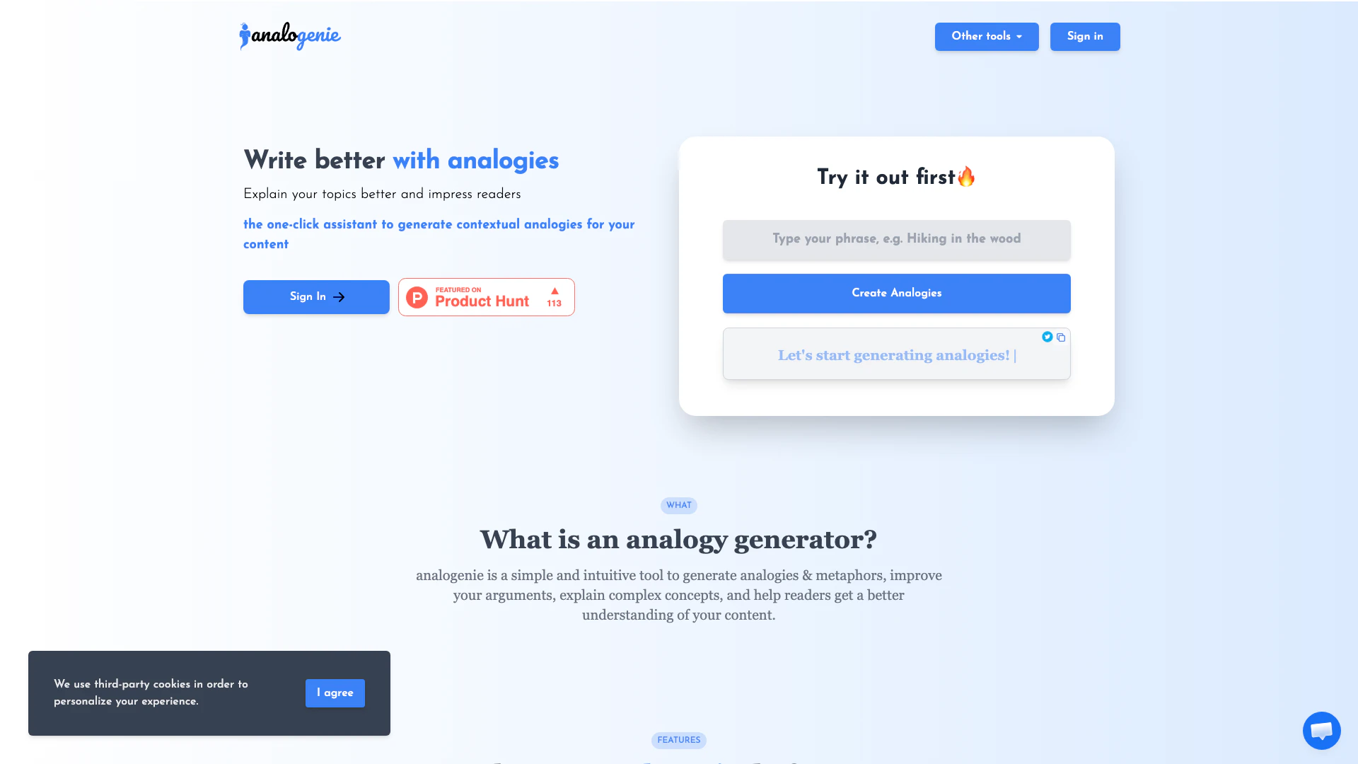 Analogenie là một công cụ tạo phép ẩn dụ giúp bạn viết những phép ẩn dụ sáng tạo để thu hút sự chú ý của khán giả. Nó hoạt động bằng cách tạo ra một phép ẩn dụ hoàn chỉnh dựa trên đầu vào của bạn.