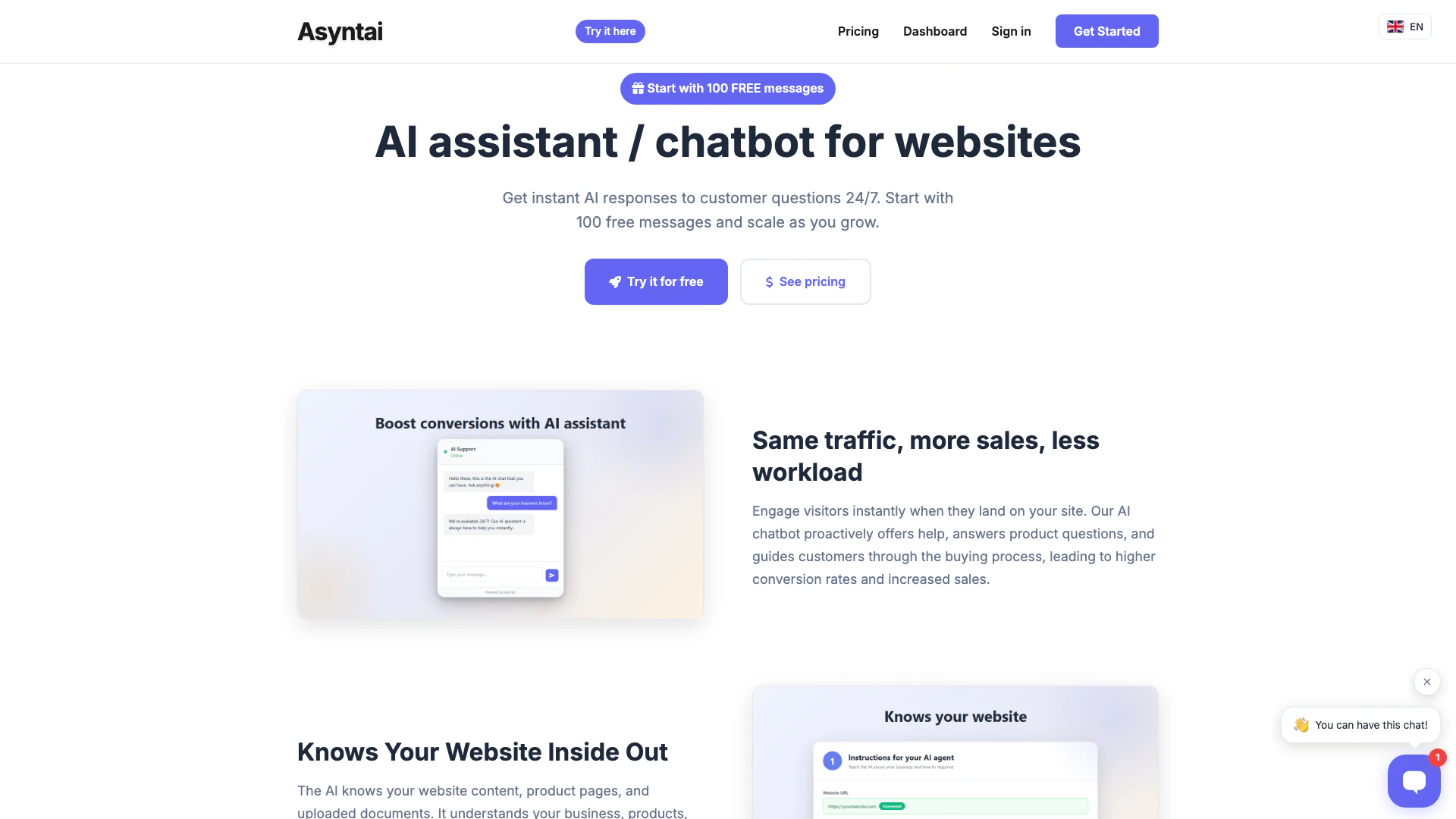- Cài đặt và Tùy chỉnh Nhanh chóng: Asyntai cho phép người dùng tạo và khởi chạy trợ lý AI hoặc chatbot cho trang web của họ chỉ trong vài phút, với các tùy chọn tùy chỉnh dễ dàng để phù hợp với bản sắc thương hiệu.