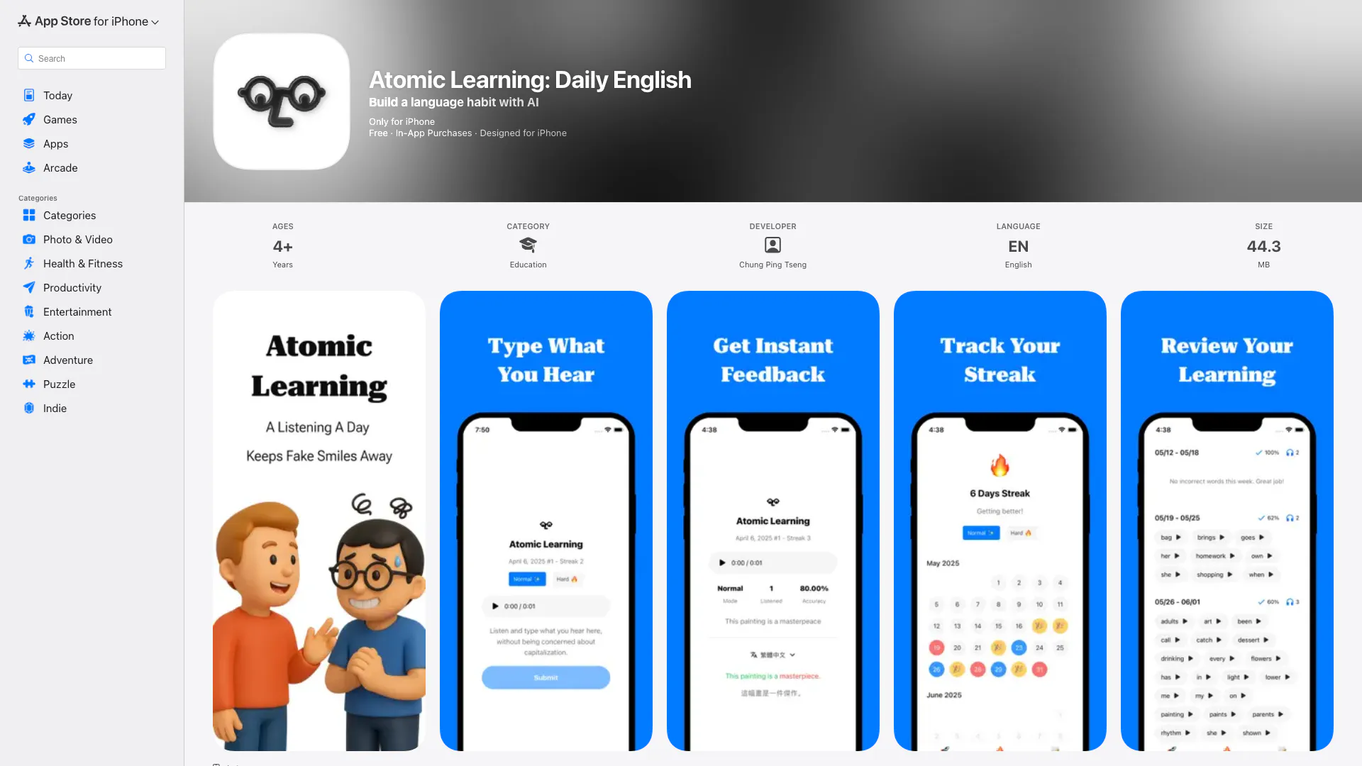 Atomic Learning là một thử thách học ngôn ngữ miễn phí sử dụng AI, cung cấp các bài tập nghe hàng ngày. Nó giúp người dùng cải thiện kỹ năng nghe, đặc biệt là những người chuẩn bị cho các bài kiểm tra trình độ tiếng Anh như TOEIC, TOEFL hoặc IELTS.