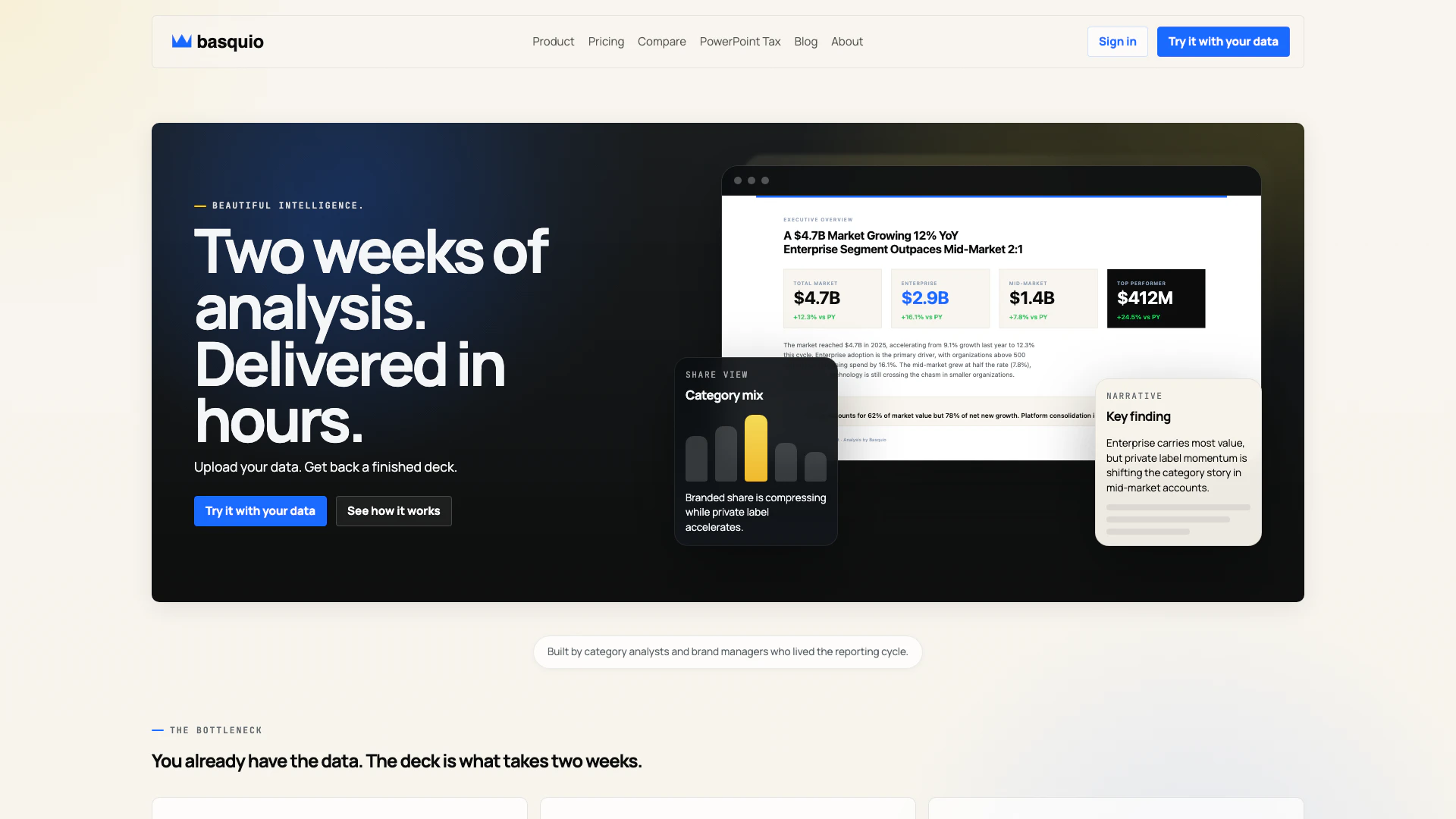 Basquio là một công cụ AI sáng tạo được thiết kế để đơn giản hóa quy trình phân tích dữ liệu và tạo ra các bài thuyết trình. Nó cho phép người dùng tải lên nhiều loại tệp dữ liệu khác nhau, bao gồm CSV, Excel và PDF, và tự động tạo ra một bộ phân tích toàn diện bao gồm biểu đồ thực, báo cáo tường thuật và đầu ra PowerPoint (PPTX) có thể chỉnh sửa. Chức năng độc đáo này của việc phân tích dữ liệu và đồng thời xây dựng một bài thuyết trình đã làm cho Basquio nổi bật trong lĩnh vực công cụ trực quan hóa dữ liệu và báo cáo.
