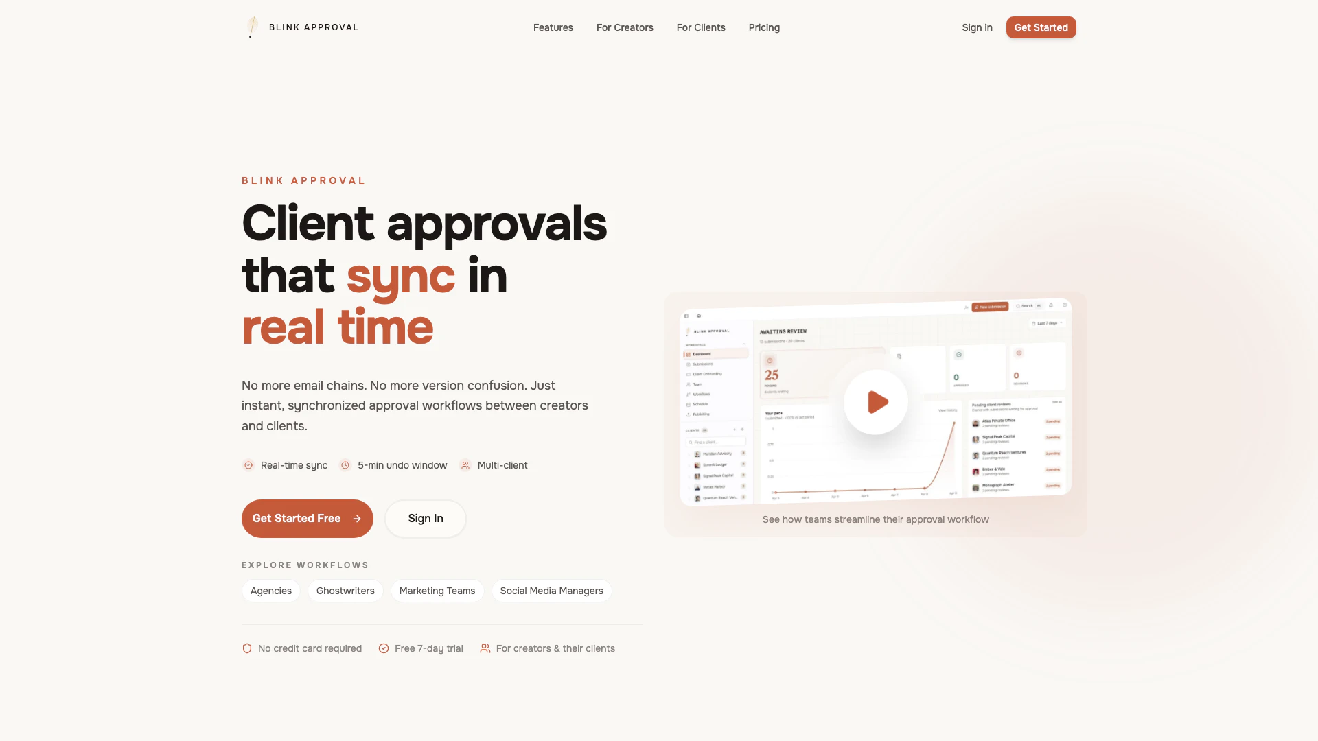 Blinkapproval là phần mềm phê duyệt khách hàng được thiết kế đặc biệt cho các cơ quan, nhà văn ma, đội ngũ marketing và quản lý mạng xã hội. Nó đơn giản hóa quy trình thu thập phản hồi và phê duyệt từ khách hàng bằng cách cho phép người dùng chia sẻ các liên kết xem xét an toàn, theo dõi các phiên bản và duy trì hồ sơ toàn diện về tất cả các quyết định đã được đưa ra. Công cụ này nâng cao sự hợp tác bằng cách cho phép hiển thị ngay lập tức các bài nộp, tạo điều kiện cho phản hồi trực tiếp và đảm bảo rằng mọi khía cạnh của quy trình phê duyệt đều được tổ chức và hiệu quả.