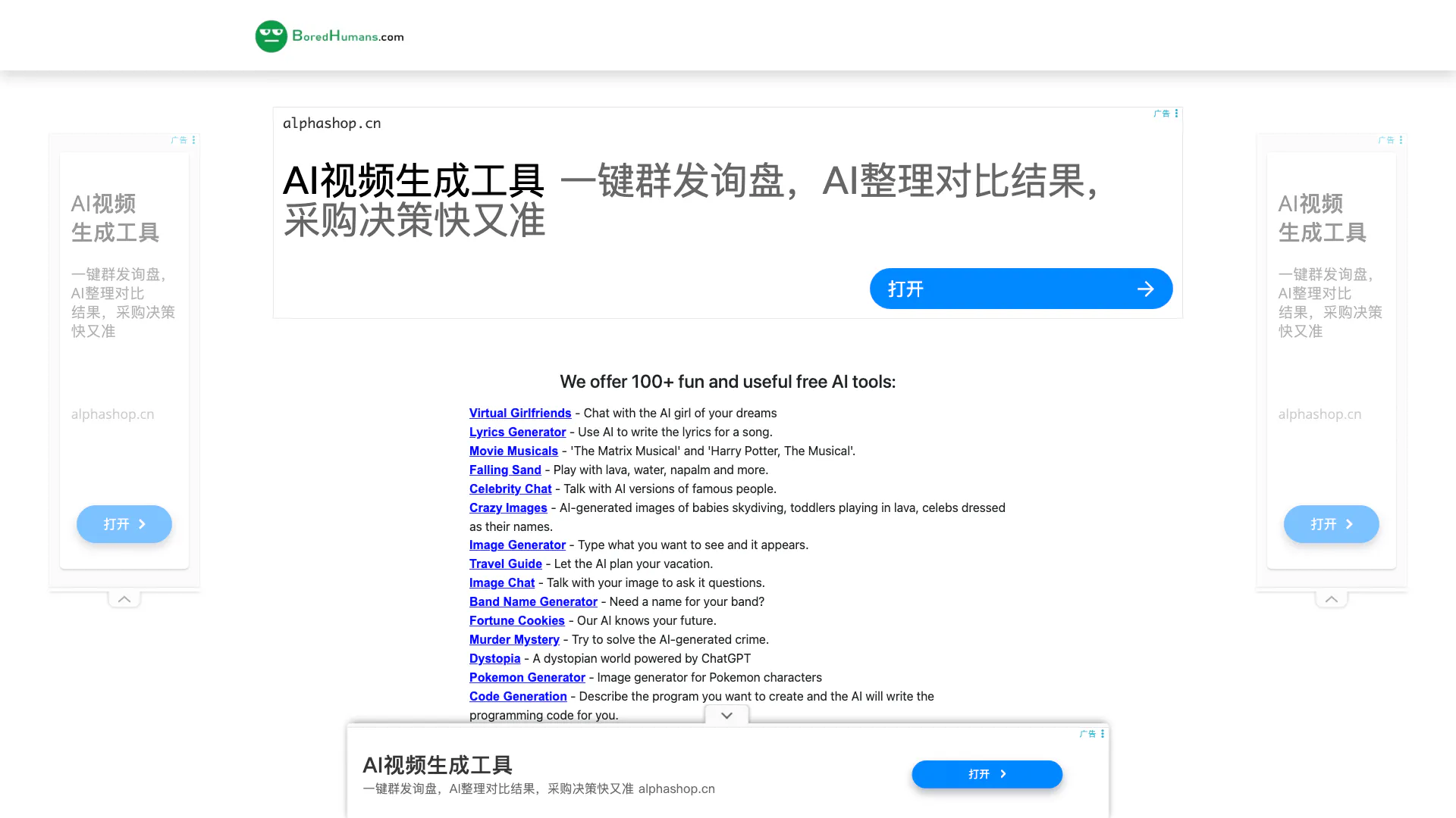 BoredHumans.com là một trang web cung cấp hơn 100 công cụ AI miễn phí cho nhiều ứng dụng thú vị và hữu ích.