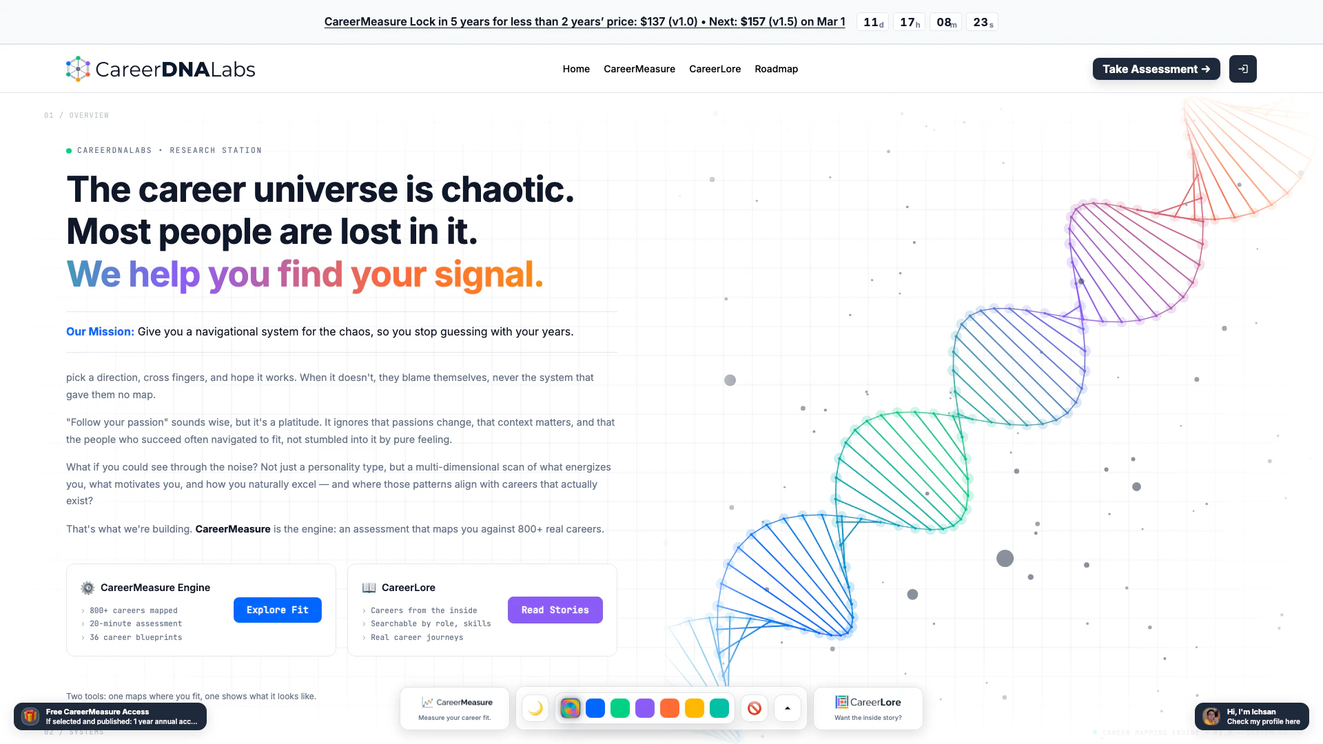 CareerDNALabs là một nền tảng sáng tạo được thiết kế để cung cấp cho cá nhân một hệ thống điều hướng cho con đường sự nghiệp của họ. Nó nhằm loại bỏ sự đoán mò liên quan đến các quyết định nghề nghiệp bằng cách cung cấp hai công cụ chính: CareerMeasure và CareerLore. CareerMeasure là một công cụ đánh giá giúp người dùng so sánh với hơn 800 nghề nghiệp thực tế, giúp họ hiểu được sự phù hợp của mình dựa trên các kỹ năng, động lực và sở thích độc đáo. CareerLore bổ sung điều này bằng cách cung cấp các nghiên cứu trường hợp và cái nhìn thực tế về các nghề nghiệp khác nhau, cho thấy các con đường khác nhau trông như thế nào từ bên trong. Cùng nhau, những công cụ này giúp người dùng đưa ra những lựa chọn nghề nghiệp thông minh hơn thay vì dựa vào sự may rủi.