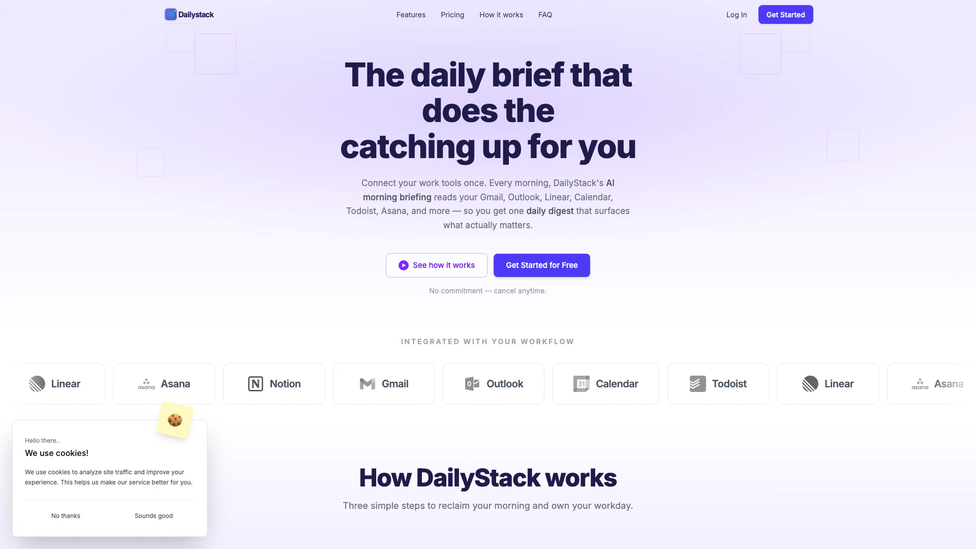 DailyStackAI là một công cụ sáng tạo được thiết kế để đơn giản hóa thói quen buổi sáng của bạn bằng cách tập hợp thông tin từ nhiều công cụ làm việc khác nhau vào một bản tóm tắt hàng ngày duy nhất. Bằng cách kết nối email, lịch, quản lý công việc và các ứng dụng quản lý dự án như Gmail, Outlook, Linear, Calendar, Todoist và Asana, DailyStackAI đọc và tóm tắt thông tin quan trọng nhất với bạn mỗi buổi sáng. Bản tóm tắt buổi sáng do AI cung cấp đảm bảo rằng bạn luôn được thông báo về các nhiệm vụ, cuộc họp và ưu tiên mà không cần phải tìm kiếm qua nhiều ứng dụng khác nhau, biến nó thành một công cụ thiết yếu cho các chuyên gia bận rộn.