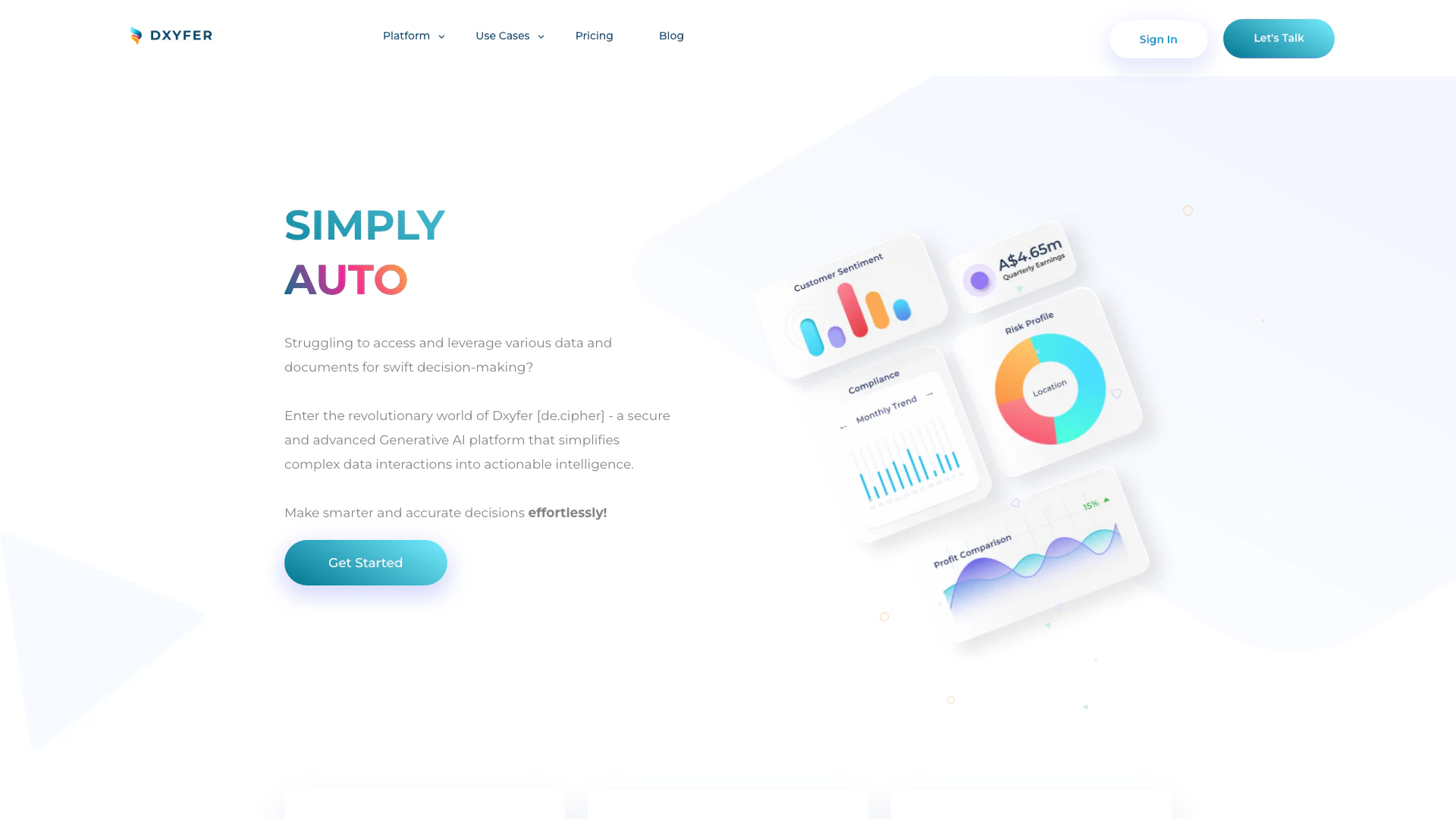 Dxyfer cung cấp một loạt các tính năng mạnh mẽ được thiết kế để nâng cao tương tác dữ liệu và ra quyết định: - AskData: Chuyển đổi nhiều nguồn dữ liệu thành những hiểu biết có thể hành động. - AskDocs: Nhận câu trả lời dựa trên ngữ cảnh từ nhiều tài liệu. - AutoDash: Giám sát KPI thông qua các bảng điều khiển AI tùy chỉnh. - Trực quan hóa trực quan: Truy cập các bảng điều khiển tương tác hiển thị xu hướng theo thời gian thực. - Tích hợp dễ dàng: Tích hợp liền mạch với các hệ thống ERP và kho dữ liệu hiện có. - Kiến trúc AI/ML: Được thiết kế để xử lý khối lượng lớn dữ liệu đa dạng ngay lập tức.