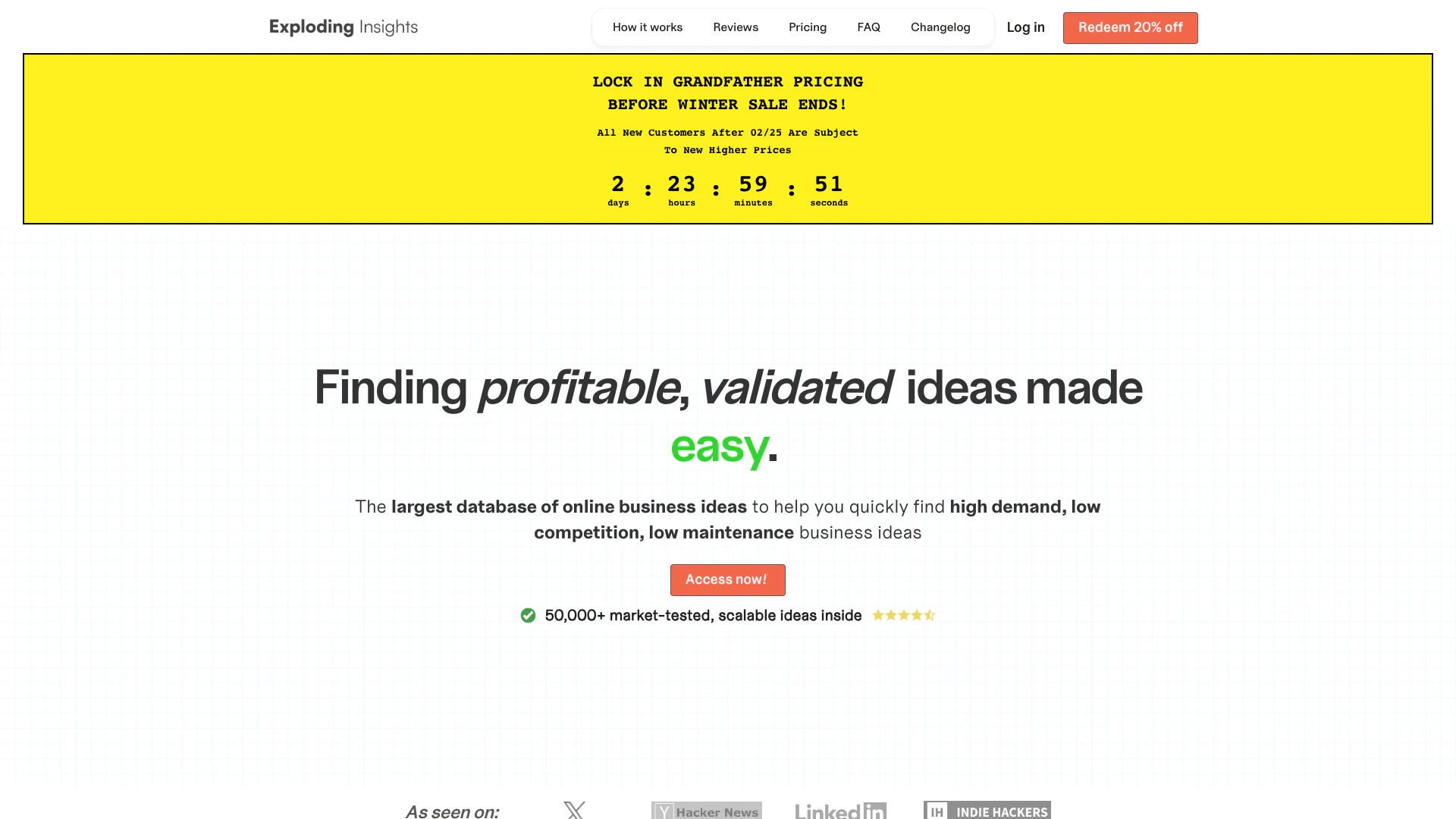 - Cơ sở dữ liệu ý tưởng phong phú: Exploding Insights có cơ sở dữ liệu hơn 50.000 ý tưởng kinh doanh đã được kiểm tra trên thị trường, giúp người dùng nhanh chóng xác định các cơ hội có lợi nhuận.