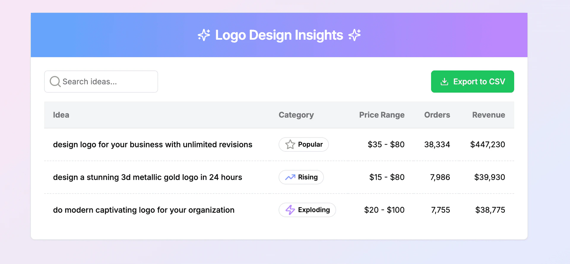 - Thông tin chi tiết được hỗ trợ bởi AI: Công cụ này sử dụng AI tiên tiến để phân tích dữ liệu từ nhiều nguồn khác nhau, cung cấp cho người dùng những ý tưởng đã được xác thực có nhu cầu cao và cạnh tranh thấp.