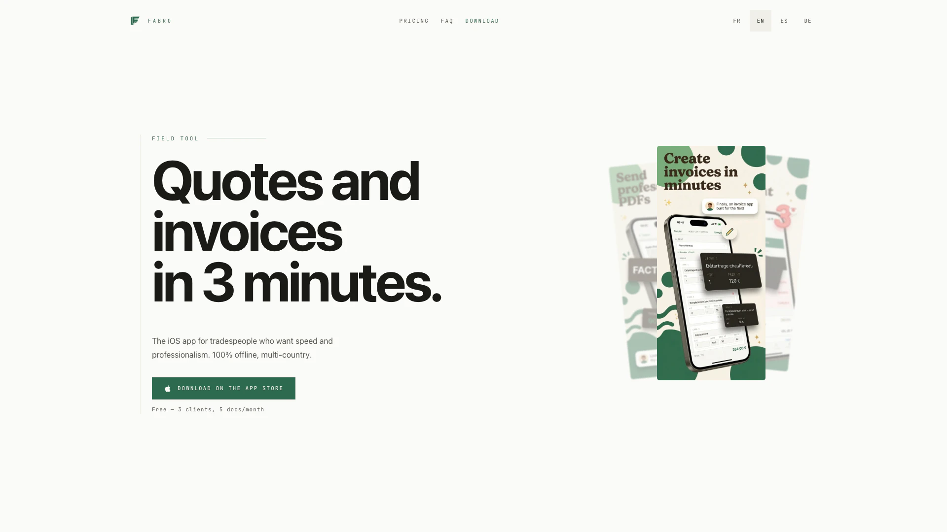 Fabro là một ứng dụng iOS sáng tạo được thiết kế đặc biệt cho những người làm nghề tự do, những người ưu tiên tốc độ và tính chuyên nghiệp trong quy trình lập hóa đơn của họ. Công cụ này cho phép người dùng tạo báo giá và hóa đơn nhanh chóng, trong khi vẫn hoàn toàn hoạt động ngoại tuyến. Với hỗ trợ đa quốc gia, Fabro được điều chỉnh để đáp ứng nhu cầu độc đáo của những người làm nghề tự do hoạt động tại nhiều quốc gia châu Âu, bao gồm Pháp, Tây Ban Nha, Đức và Vương quốc Anh. Giá trị cốt lõi của nó nằm ở việc cung cấp trải nghiệm lập hóa đơn liền mạch, hiệu quả, nâng cao tính chuyên nghiệp của những người làm nghề tự do.