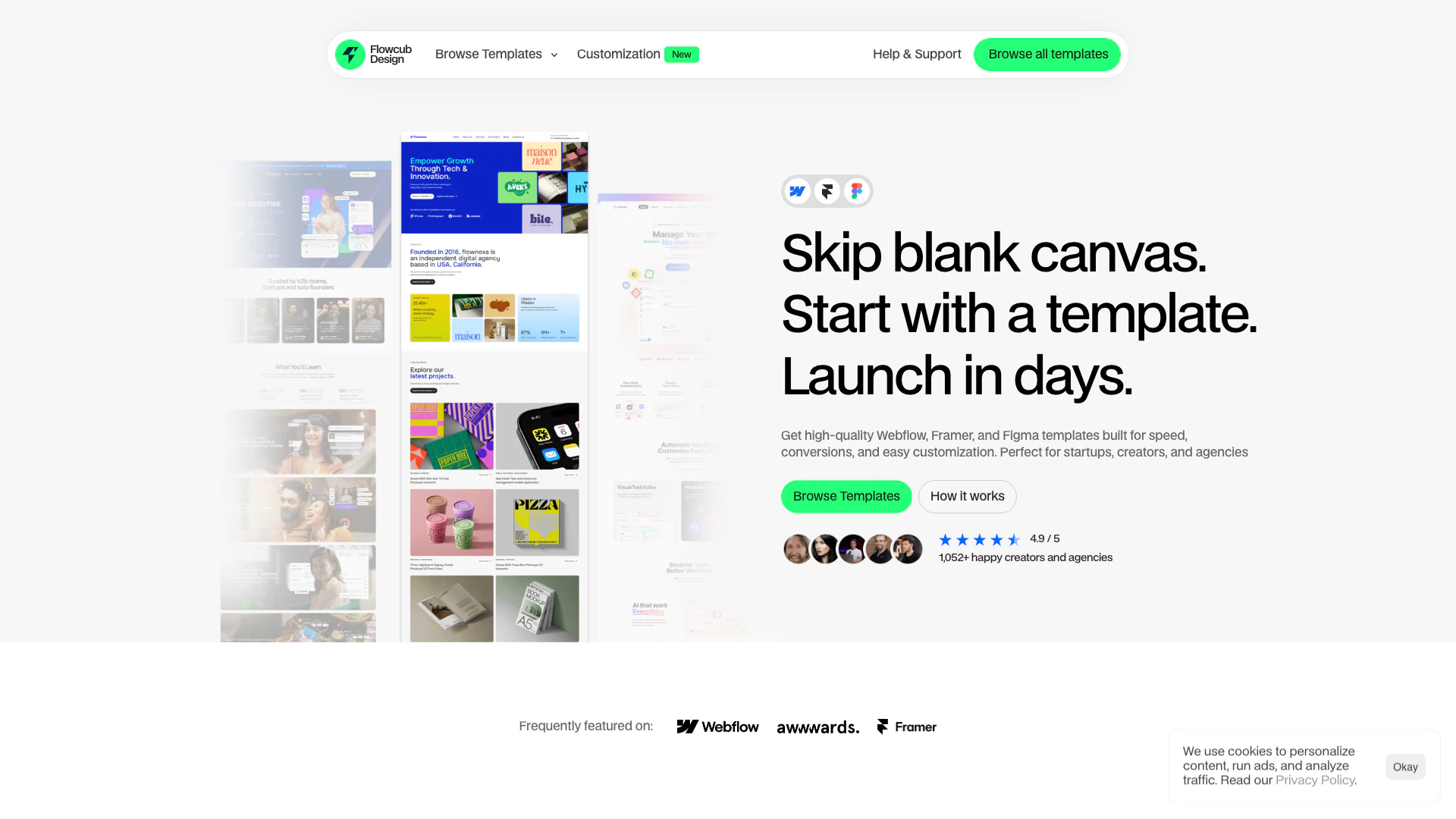- Chọn một mẫu: Duyệt qua bộ sưu tập mẫu phong phú của Flowcub được thiết kế cho Framer, Webflow và Figma để tìm một mẫu phù hợp với nhu cầu dự án của bạn.