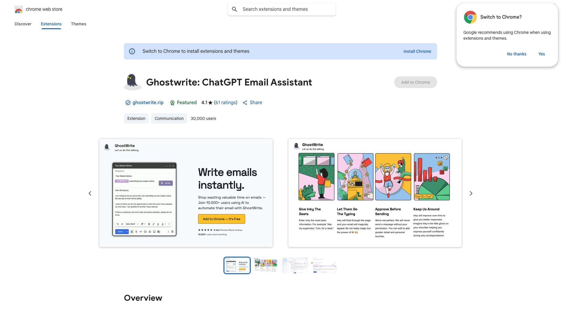Để sử dụng Ghostwrite, hãy cài đặt tiện ích mở rộng trong ứng dụng email của bạn. Bắt đầu bằng cách nhập một vài từ hoặc điểm, và Ghostwrite sẽ tạo ra một email hoàn chỉnh. Bạn cũng có thể sử dụng phản hồi thông minh chỉ bằng một cú nhấp chuột, tùy chỉnh tông giọng email của bạn và tự động hóa các tin nhắn lặp lại một cách dễ dàng.