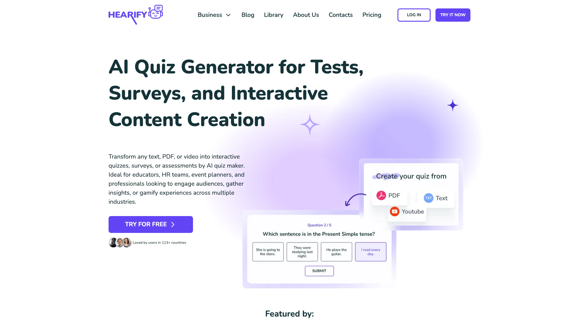 Hearify là một trình tạo quiz AI sáng tạo được thiết kế để biến đổi nhiều loại nội dung—bao gồm văn bản, PDF và video—thành các quiz, khảo sát và đánh giá tương tác. Nó nhằm mục đích nâng cao sự tham gia và cải thiện kết quả học tập bằng cách cho phép người dùng tạo quiz tùy chỉnh một cách dễ dàng. Công cụ này đặc biệt hữu ích cho các nhà giáo dục, đội ngũ nhân sự, người tổ chức sự kiện và các chuyên gia trong nhiều ngành nghề khác nhau đang tìm cách gamify trải nghiệm và thu thập thông tin quý giá.