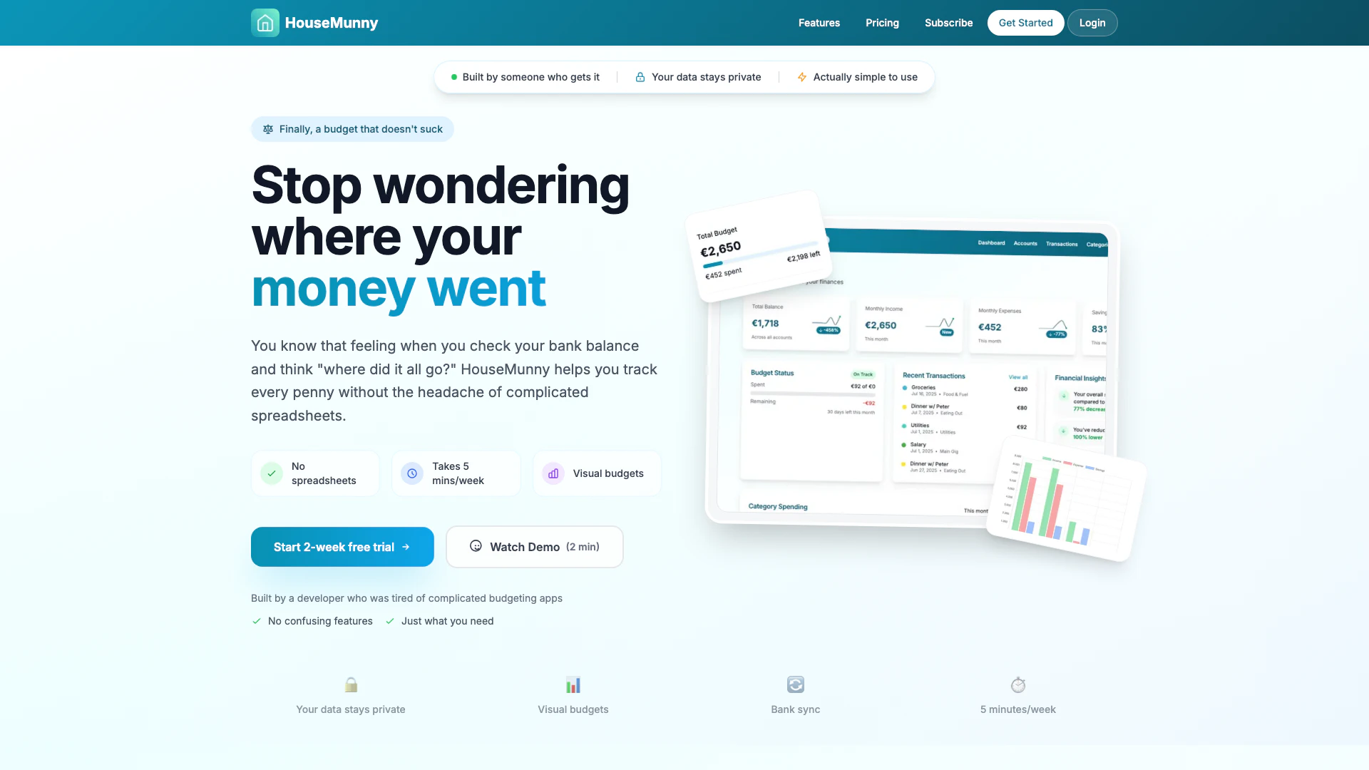 HouseMunny là một công cụ lập ngân sách và theo dõi chi tiêu sáng tạo, được thiết kế để giúp người dùng quản lý tài chính của họ một cách dễ dàng. Nó cho phép cá nhân theo dõi từng đồng tiền đã chi, xây dựng ngân sách hiệu quả và tìm kiếm cơ hội tiết kiệm chỉ trong 5 phút mỗi tuần. Với sự chú trọng vào quyền riêng tư của người dùng và sự đơn giản, HouseMunny loại bỏ nhu cầu sử dụng bảng tính phức tạp, giúp nó trở nên dễ tiếp cận cho bất kỳ ai muốn kiểm soát tình hình tài chính của mình. Công cụ này được xây dựng cho những ai muốn có sự rõ ràng trong thói quen chi tiêu mà không gặp rắc rối với các phương pháp lập ngân sách truyền thống.