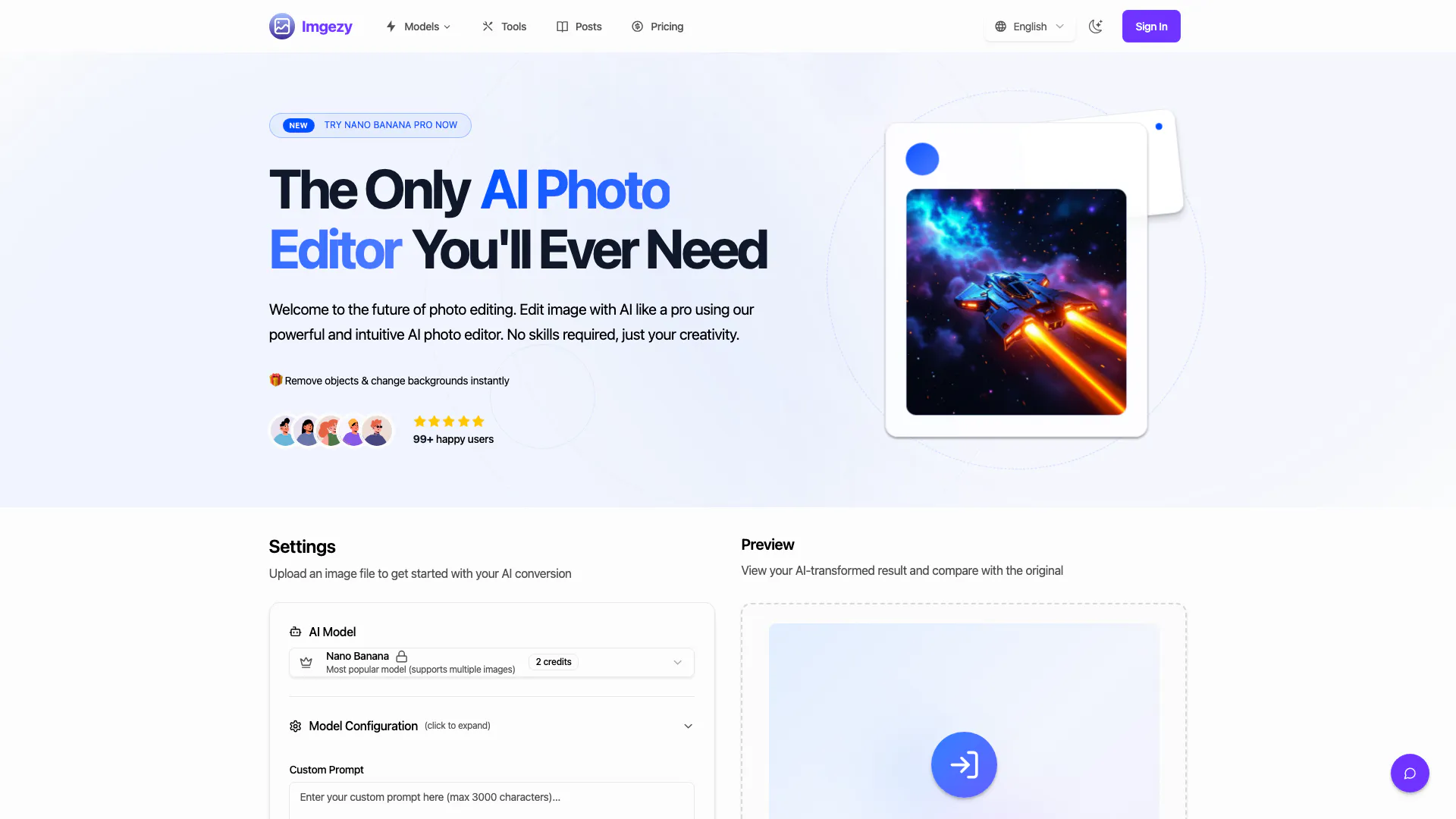 - Chỉnh sửa bằng AI: Imgezy sử dụng công nghệ AI tiên tiến để tự động loại bỏ đối tượng, thay đổi nền và cải thiện ảnh, giúp các nhiệm vụ chỉnh sửa trở nên đơn giản và hiệu quả.