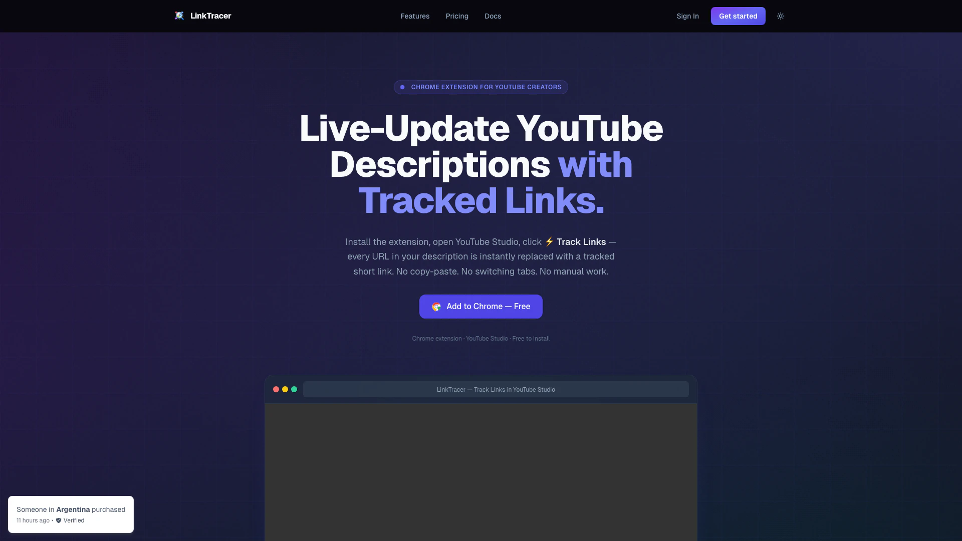 LinkTracer là một tiện ích mở rộng trên Chrome dành cho các nhà sáng tạo YouTube, tự động thay thế các URL trong mô tả video bằng các liên kết ngắn được theo dõi, cung cấp phân tích nhấp chuột theo thời gian thực.