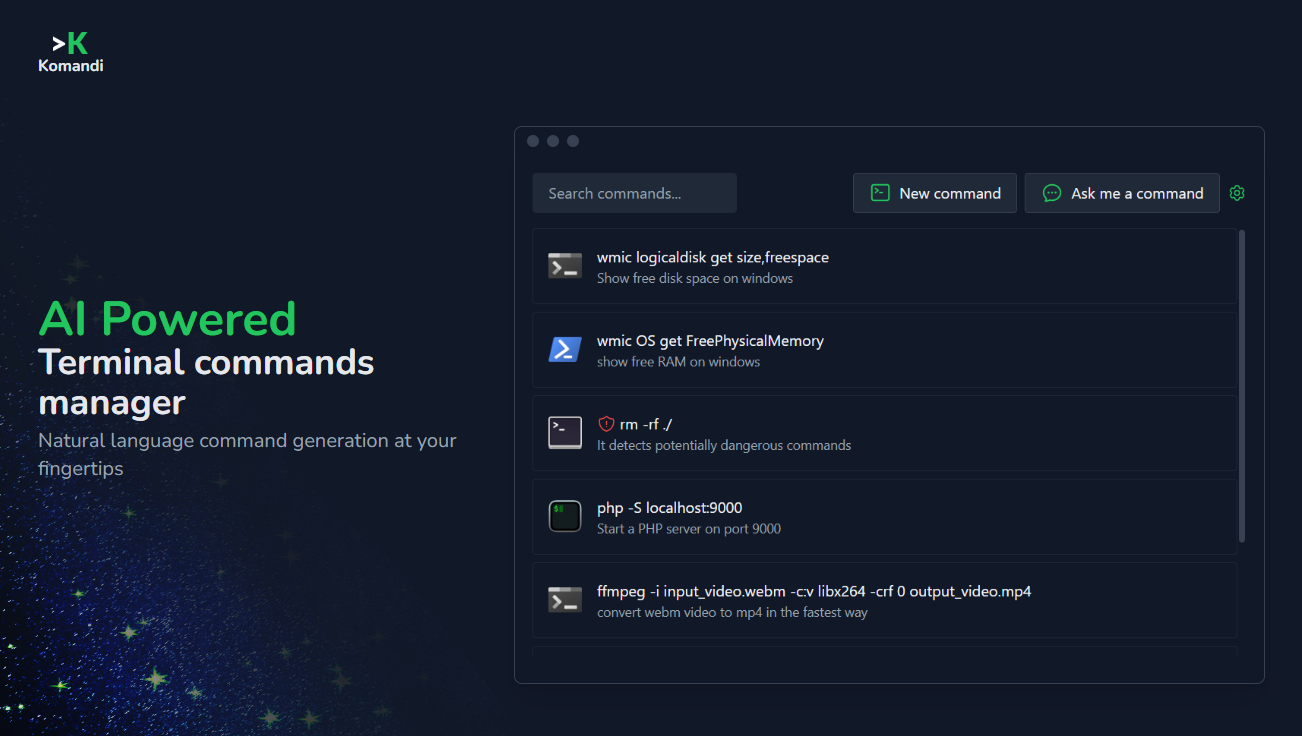 Komandi là một công cụ dành cho các nhà phát triển và quản trị viên hệ thống. Nó cho phép bạn chèn, đánh dấu yêu thích, sao chép và thực thi các lệnh của bạn. Bạn có thể sử dụng nó để quản lý các lệnh CLI thường dùng nhất, phát hiện các lệnh có thể gây nguy hiểm và nhanh chóng tạo ra các lệnh từ các yêu cầu bằng ngôn ngữ tự nhiên.