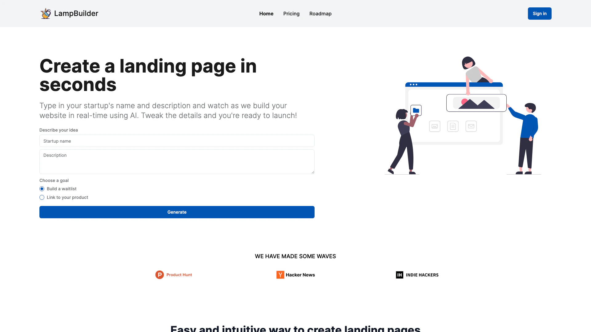 - Tạo trang đích bằng trí tuệ nhân tạo: Lampbuilder sử dụng AI để tạo trang đích ngay lập tức dựa trên tên và mô tả của startup của bạn, cho phép điều chỉnh theo thời gian thực.