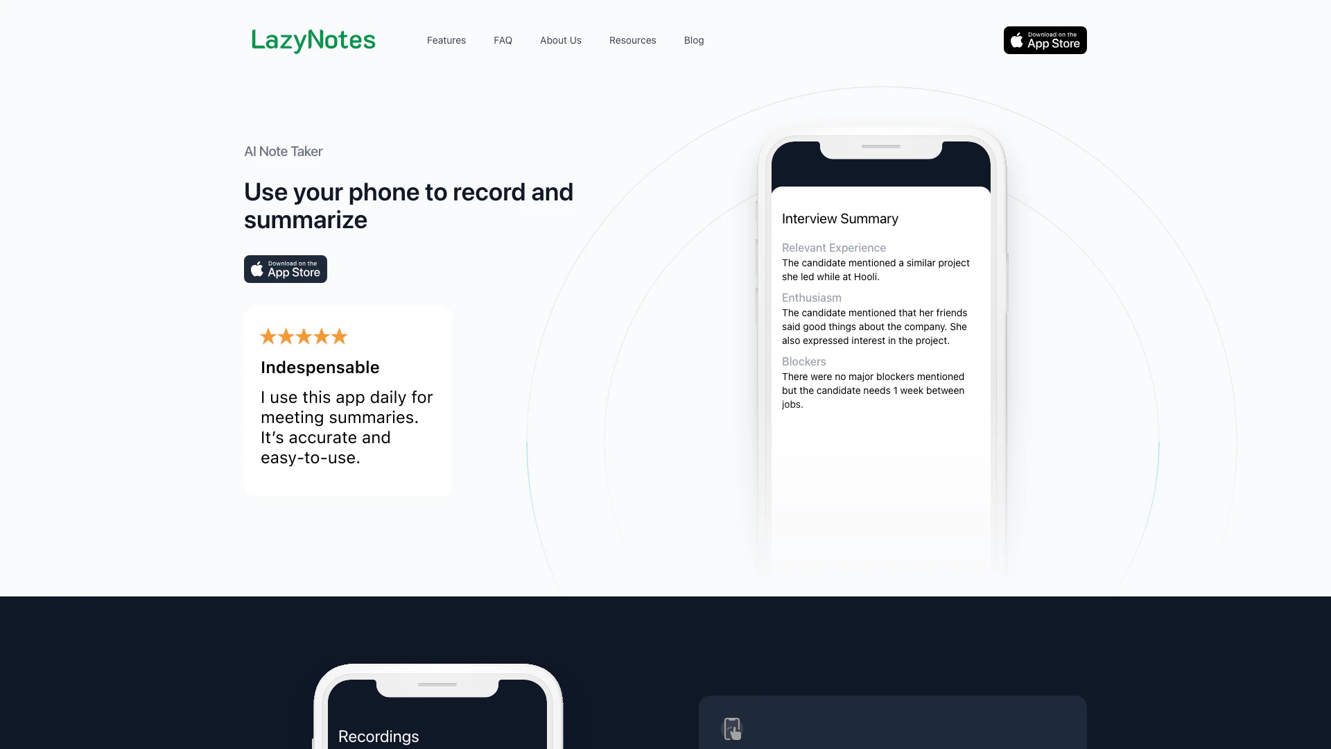 LazyNotes là một ứng dụng ghi chú được hỗ trợ bởi AI, được thiết kế đặc biệt cho người dùng iPhone. Nó cho phép người dùng dễ dàng tóm tắt và phiên âm các cuộc họp bằng cách sử dụng các gợi ý tùy chỉnh. Công cụ này nhằm nâng cao năng suất bằng cách cho phép người dùng tập trung vào việc lắng nghe trong các cuộc họp thay vì ghi chú thủ công. Với LazyNotes, người dùng có thể ghi lại các cuộc họp và nhận được các tóm tắt chi tiết, loại bỏ nhu cầu ghi chú dài dòng.